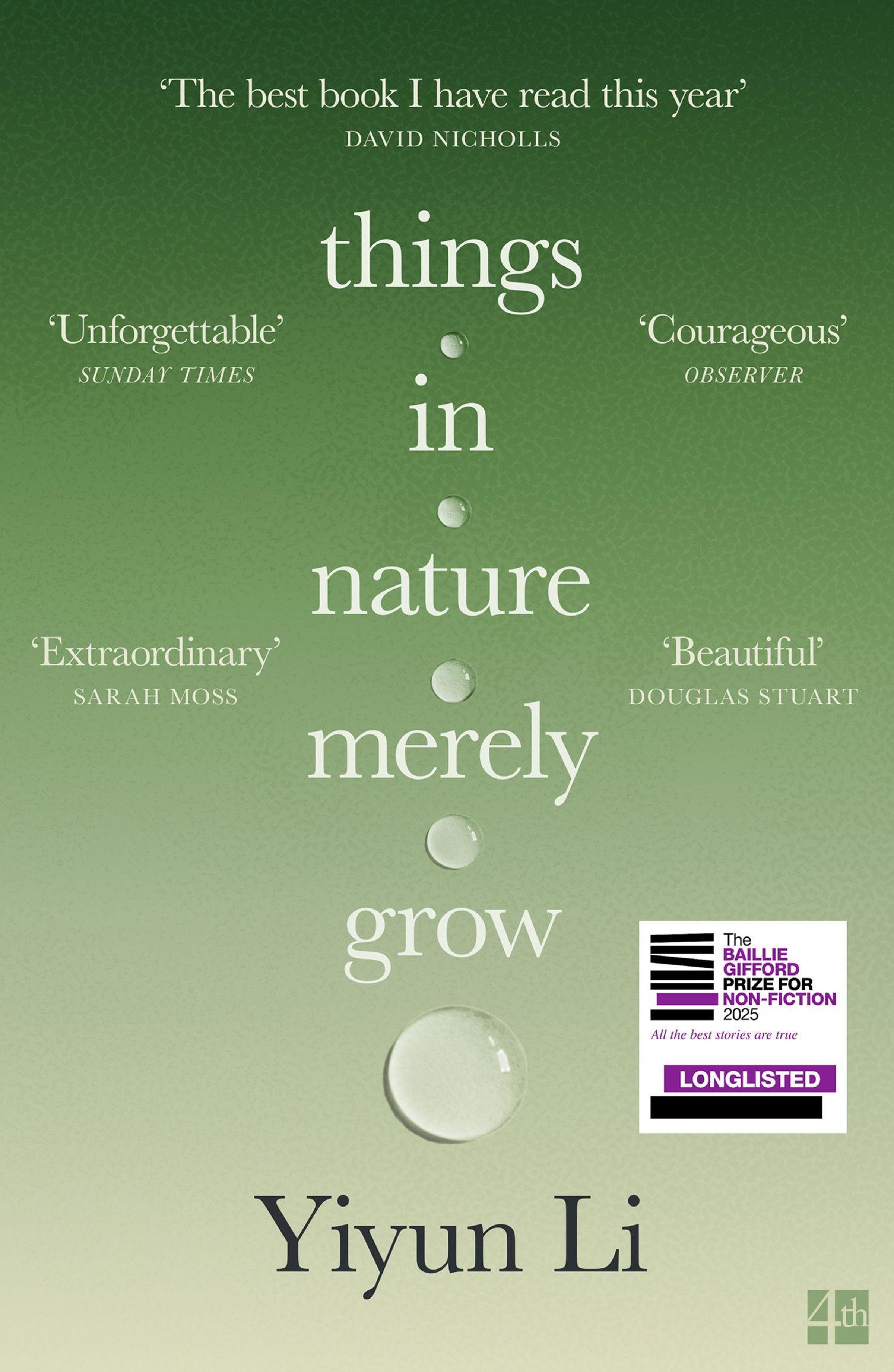 This is a book for James, but it is not a book about grieving. As Li writes, 'The verb that does not die is to be. Vincent was and is and will always be Vincent. James was and is and will always be James. We were and are and will always be their parents. There is no now and then, now and later, only, now and now and now and now.' Things in Nature Merely Grow is a testament to Li's indomitable spirit.