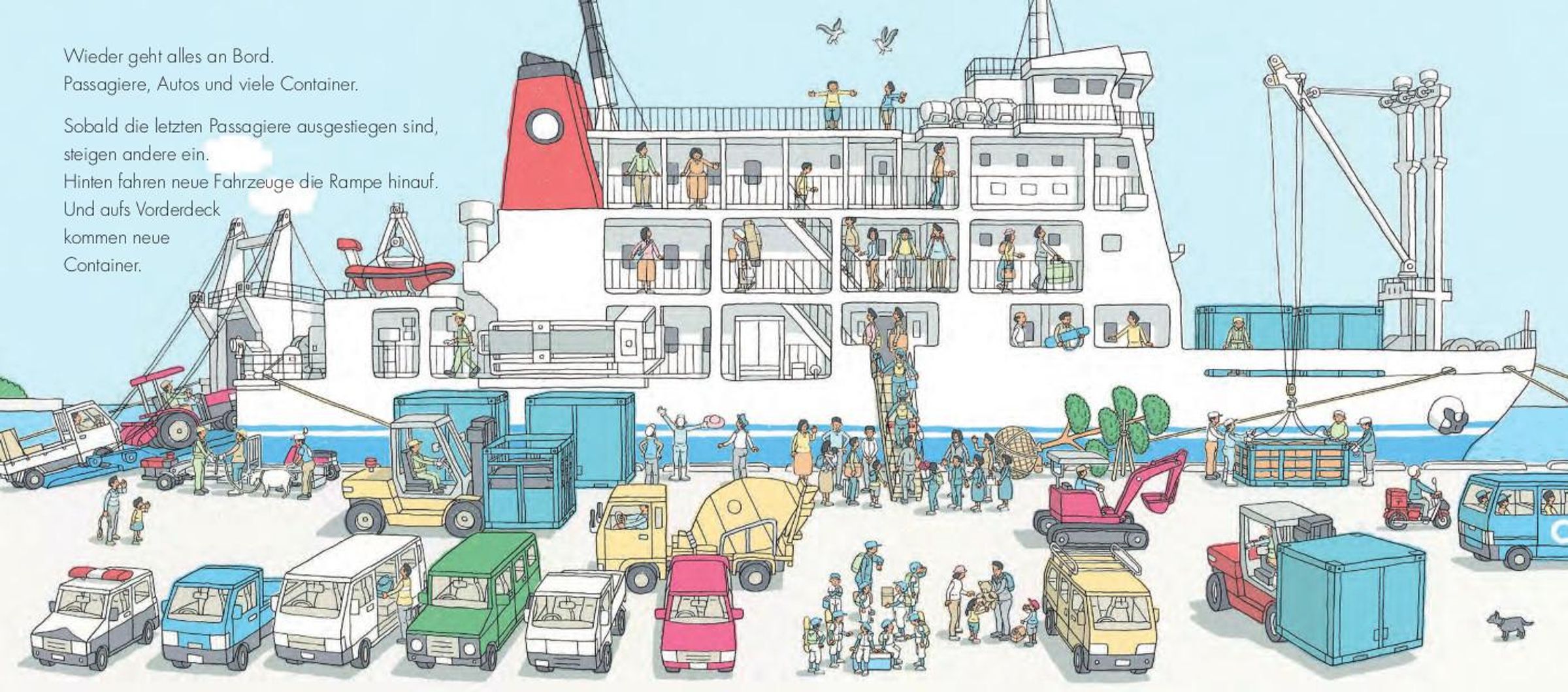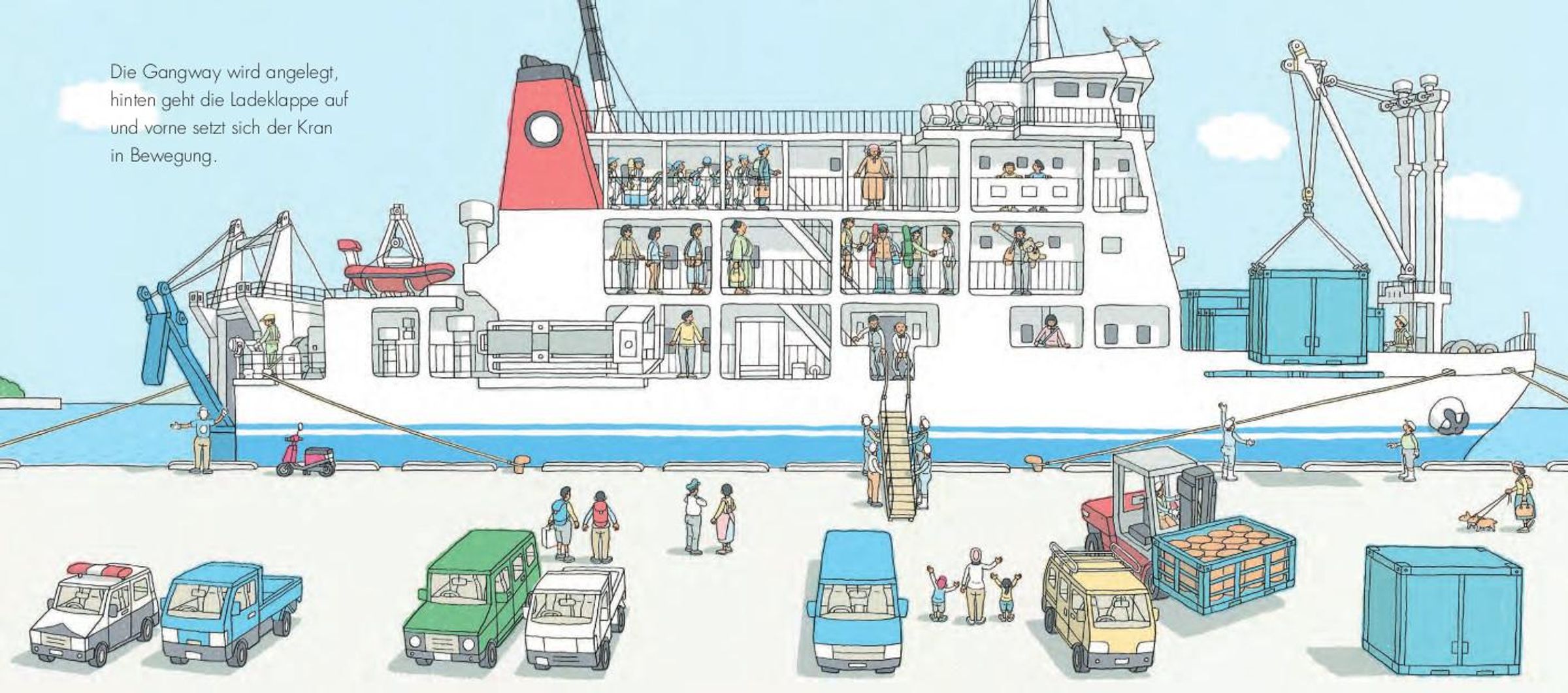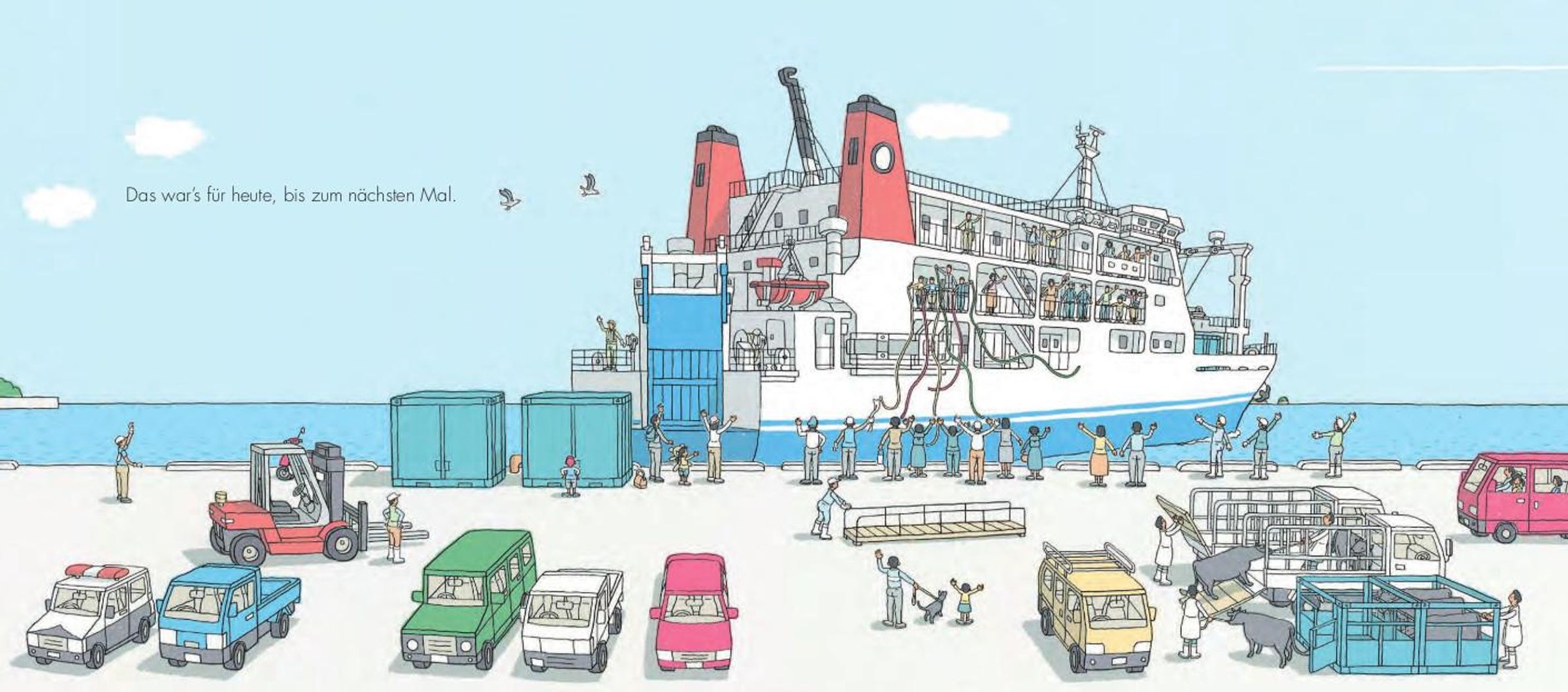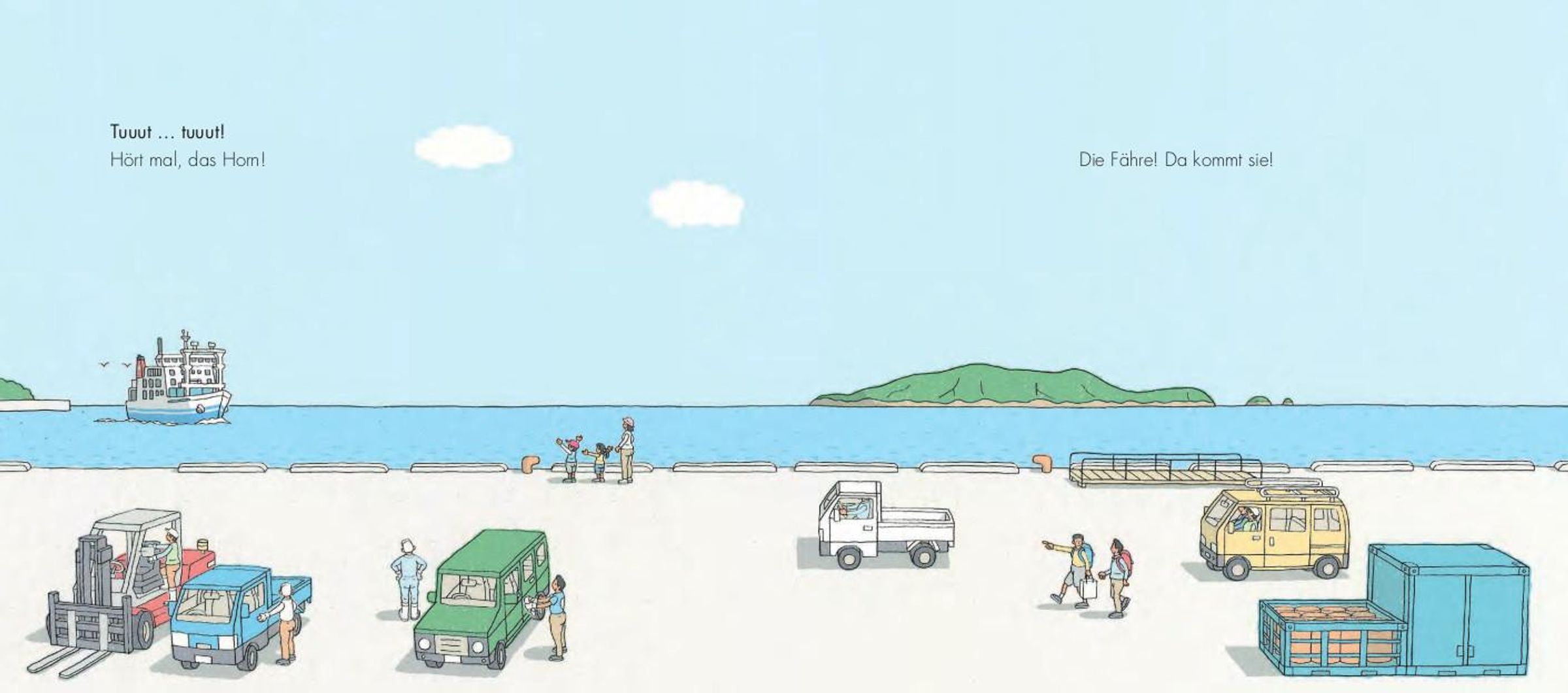 Ob Amrum, Borkum oder Sansibar: Wenn eine Fähre tutet, verwandeln sich Anlegestellen in Theaterbühnen: Wer kommt mit ihr? Wer fährt ab? Die einen schließen sich in die Arme, den anderen wird nachgewunken. Wieder andere arbeiten am Kai, bedienen Ladekräne oder achten auf die Sicherheit. Fahrzeuge rollen an Bord, sogar Vieh kommt an. All dies lässt sich in diesem Bilderbuch aus Japan verfolgen, das auf den ersten Blick leise und unspektakulär erscheint. Doch es hat es in sich und lädt zum ganz genauen Hinschauen ein. Und es erzählt Geschichten wie jene vom Papa, den seine Familie erwartet. Im Gewusel der Bilder muss man ihn immer wieder suchen, bis er mit einem riesigen Teddy die Gangway herunterkommt. Dieses Bilderbuch ist das realistische Pendant zu Thé Tjong-Khings Tortenbüchern und erst zu Ende, wenn die Fähre wieder am Horizont verschwindet.