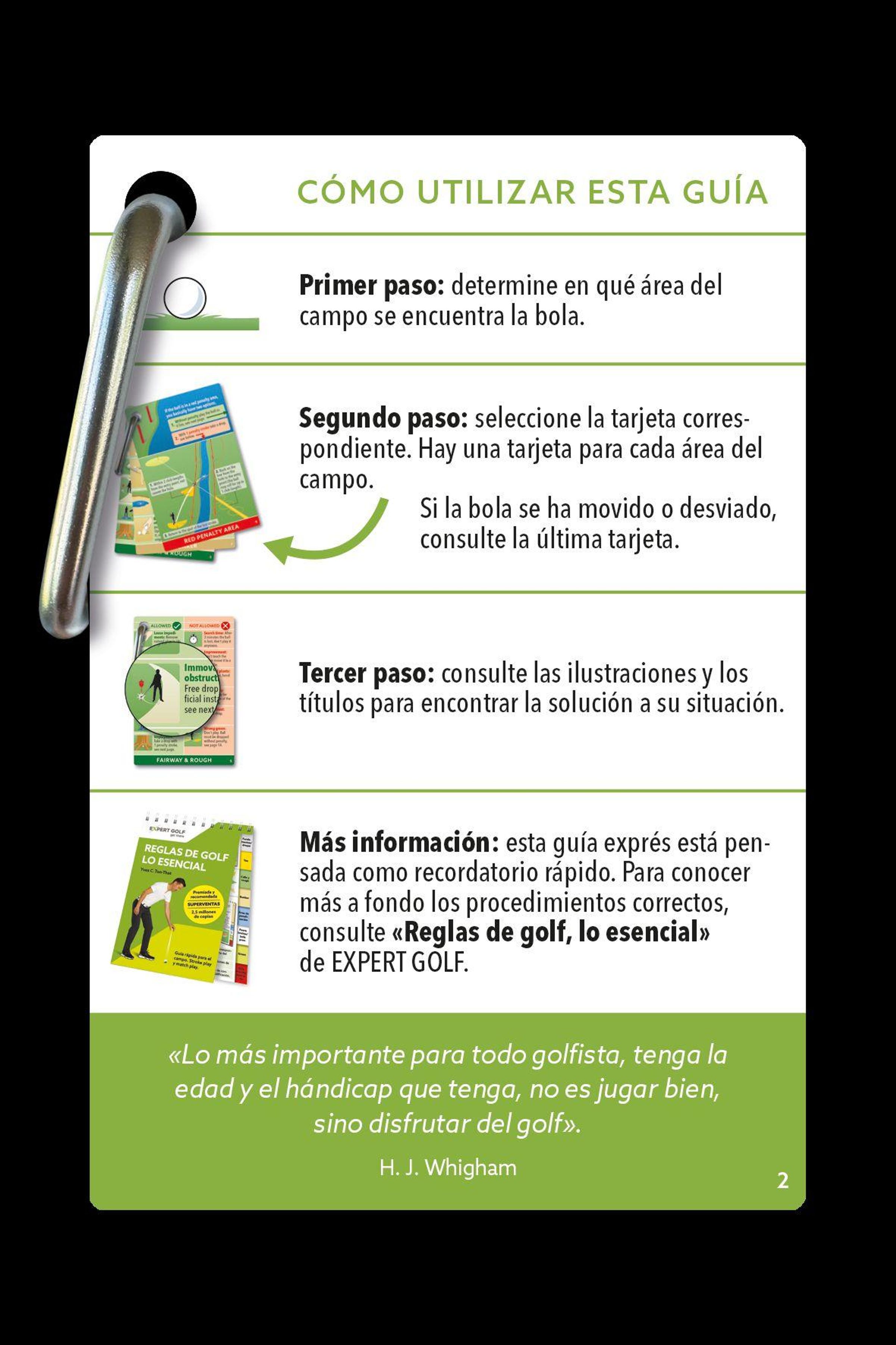 Text: "Reglas de Golf Exprés", "¡Las reglas siempre a mano!", "Formato impermeable para colgar de la bolsa".