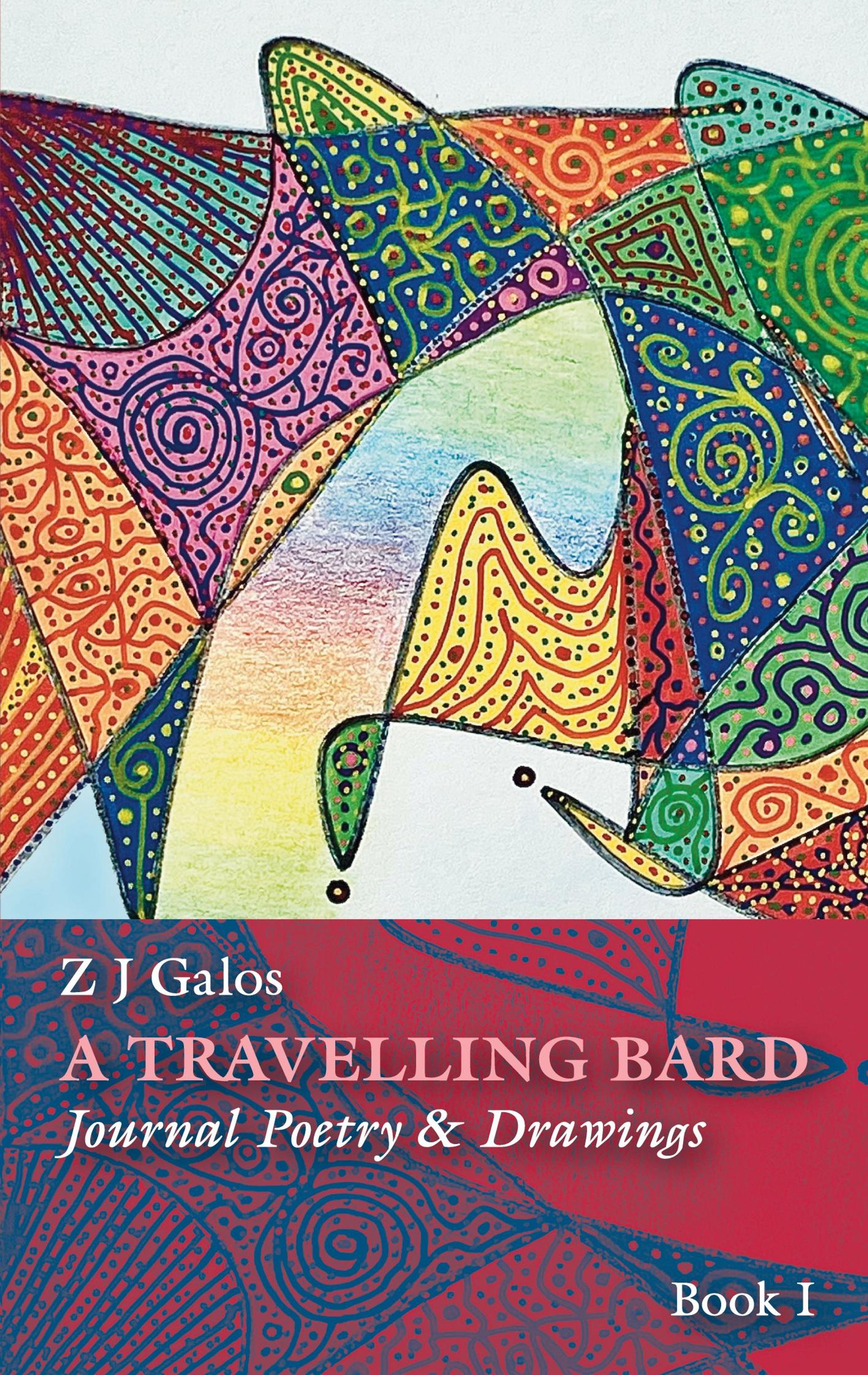 Ein Buchcover mit dem Titel: "A Travelling Bard, Journal Poetry & Drawings, Book I". Bunte, abstrakte Muster., Buch