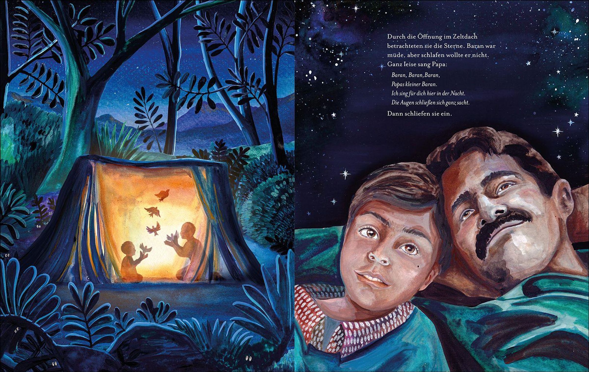 Immer wenn es regnet, denkt Baran an seinen Vater. Als er mit seiner Mutter flüchten musste, blieb der Papa zurück. Er musste die Brände löschen, vor denen sich die Menschen so fürchteten. Schließlich ist er ein Regenzauberer. Jetzt leben Baran und seine Mutter in einem fernen Land. Langsam gewöhnt er sich an die neue Sprache, an das riesige Wohnhaus, das fast bis in die Wolken reicht. Doch seinen Papa vermisst er jeden Tag. Wie schön wäre es, wenn der ihn einmal von der Vorschule abholen könnte? Bis eines Tages endlich der Moment kommt, an dem Baran seinen Vater in die Arme schließen kann.
