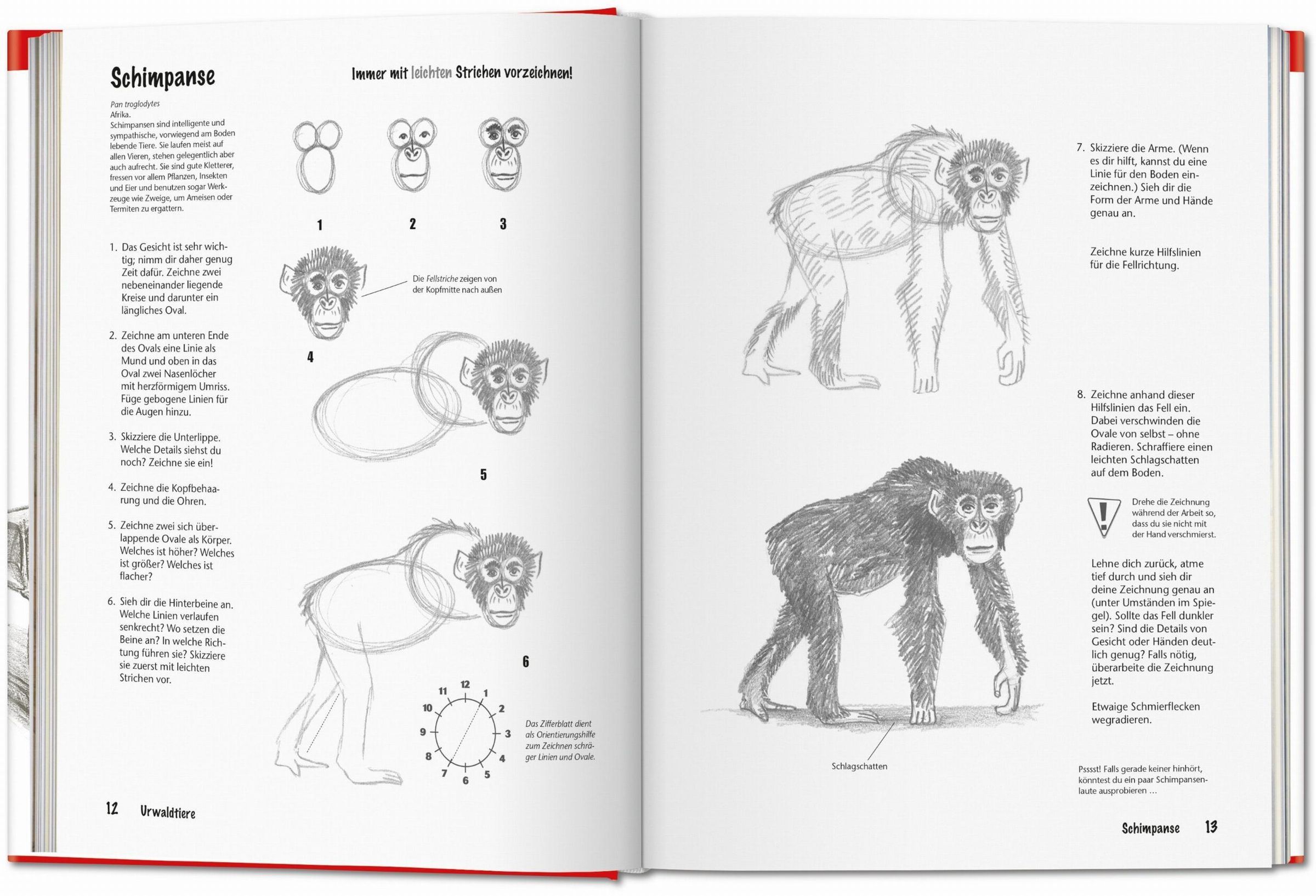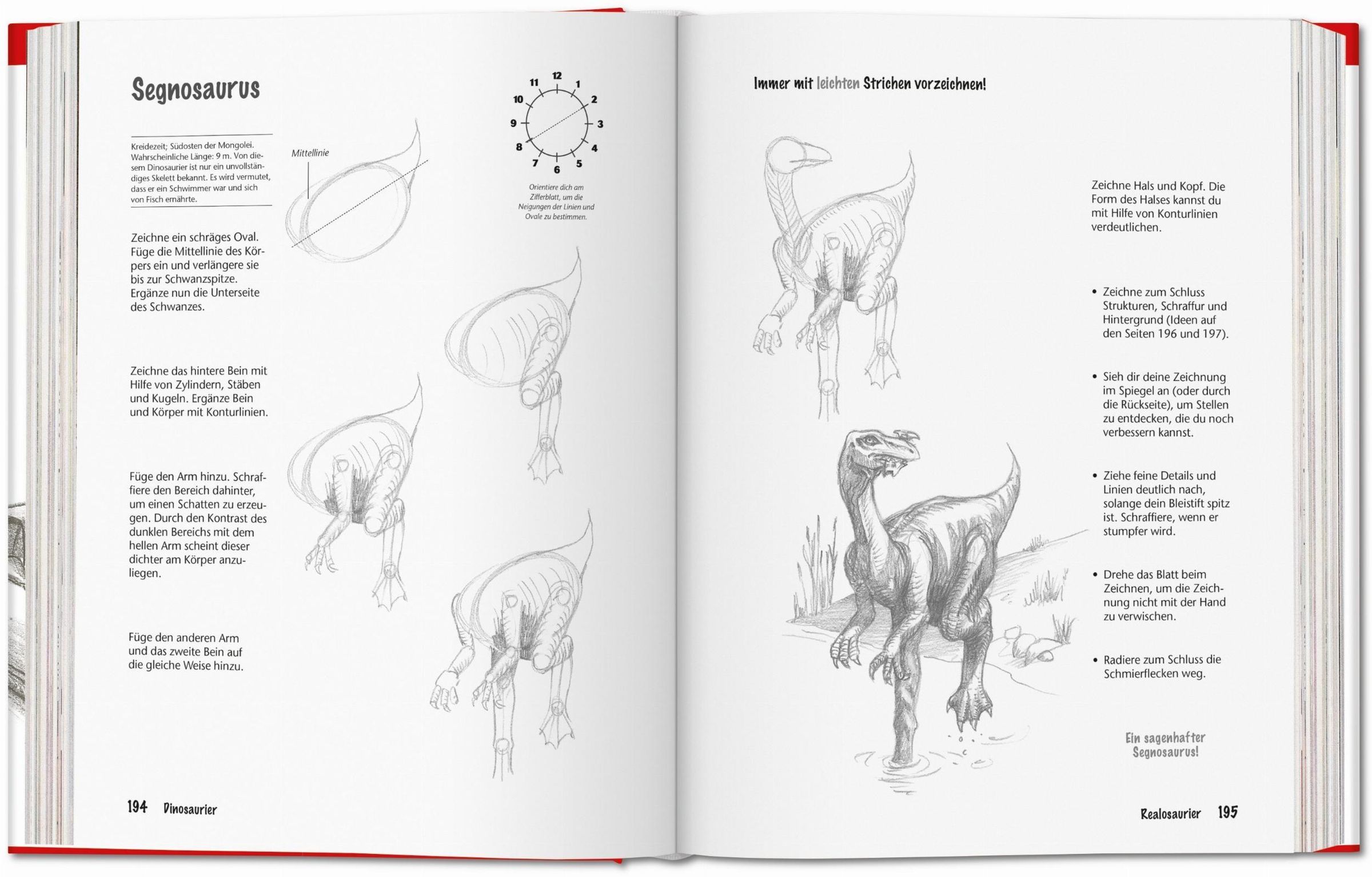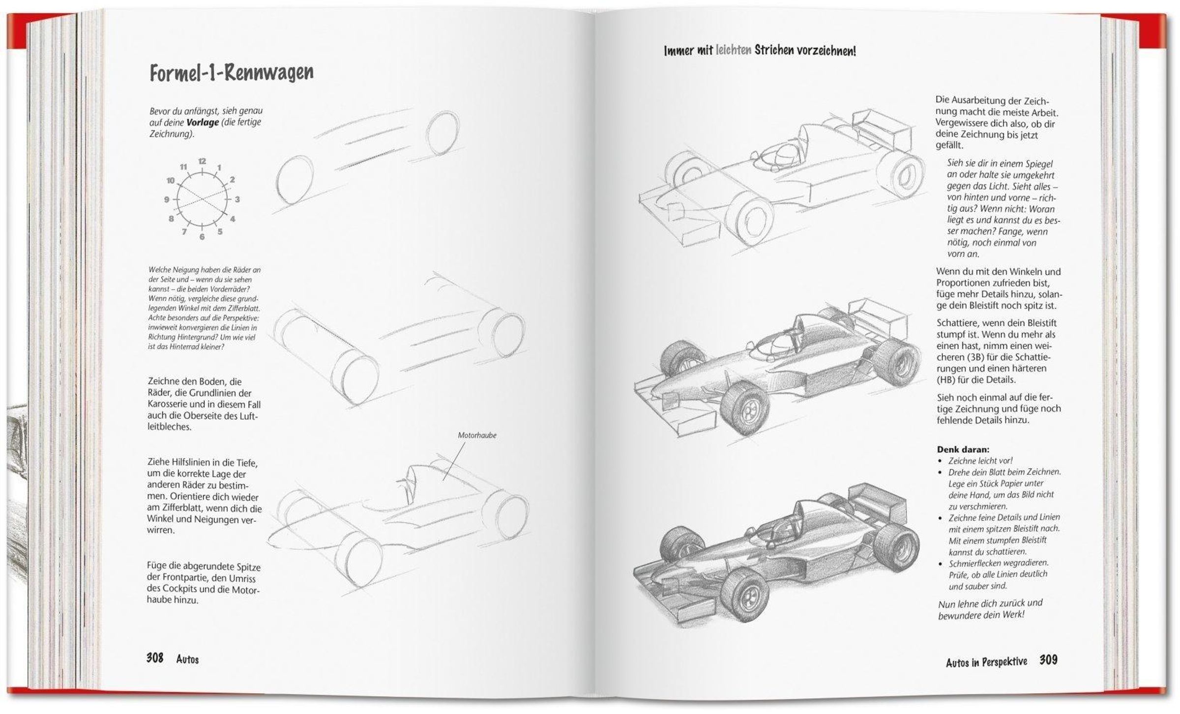 Neben vielen praktischen Hinweisen enthält dieser Band über 1.000 Abbildungen sowie kurze Einleitungstexte , die Interessantes über die abgebildeten Tiere enthalten. Dazu gibt es zahlreiche Tipps und Tricks , die den Lesern helfen, ihre Zeichnungen nach und nach realistischer wirken zu lassen - wie man etwa Autoräder zeichnet, die anatomischen Proportionen von Mensch und Tier erfasst oder realistische Hintergründe schafft. Schließlich erhalten die Lernenden eine Einführung in die Kunst der Perspektive , um ihren Zeichnungen räumliche Tiefe und Dreidimensionalität zu verleihen.