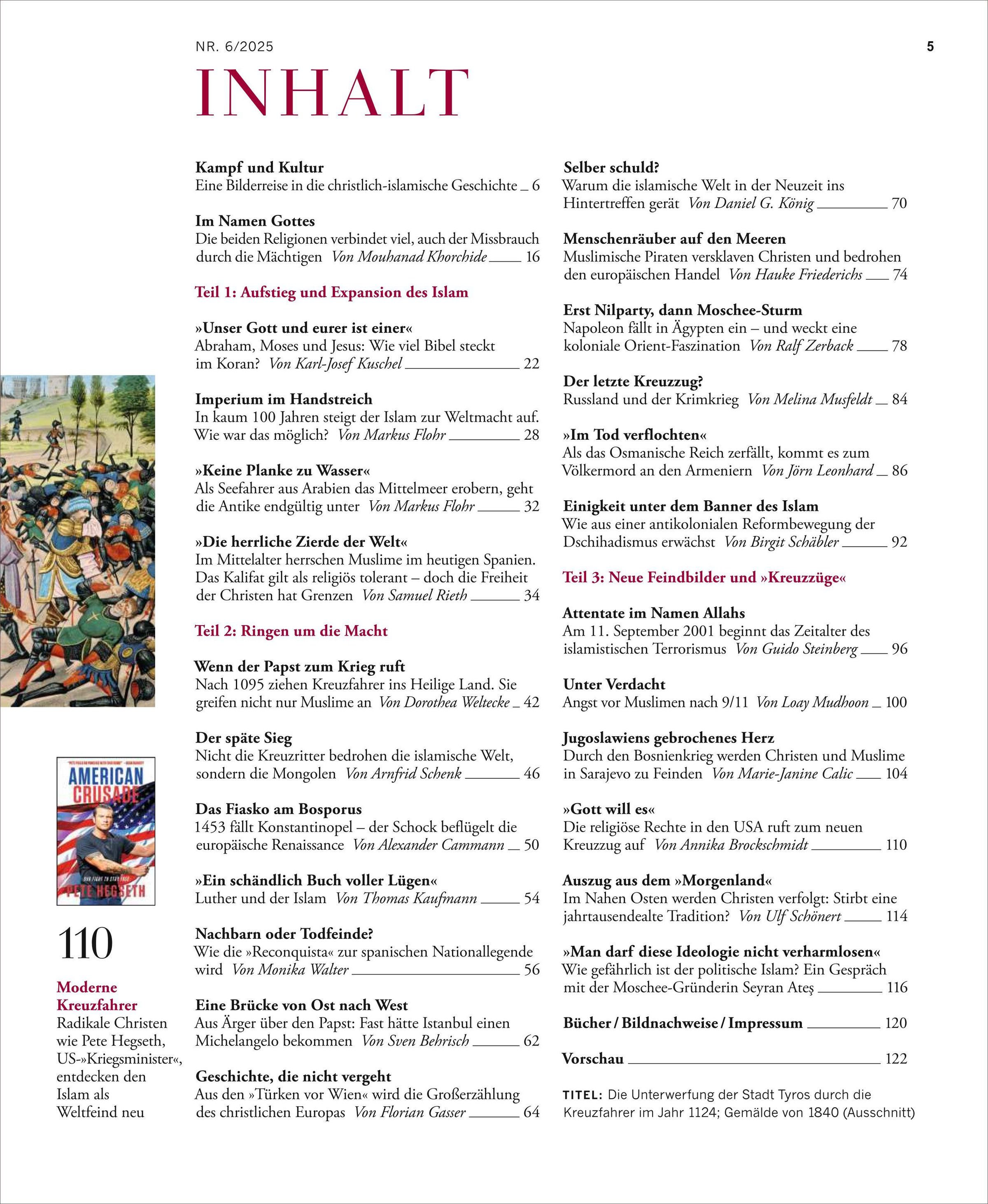 * 'Wider den Teufel selbst': Martin Luther ätzt gegen den Islam, als die Osmanen 1529 vor Wien stehen * Heiliger Sieg: Vor der Rückeroberung Jerusalems 1187 lässt sich der muslimische Feldherr Saladin feiern - erst Jahrhunderte später wird der Erfolg gegen die Kreuzritter zu einem Triumph über die Christenheit stilisiert * Gemeinsamer Glaube Der Koran stützt sich sehr viel mehr auf die Bibel, als man denkt * Wenn der Papst zum Krieg ruft: Nach 1095 ziehen Kreuzfahrer ins Heilige Land. Sie greifen nicht nur Muslime an * Erst Nilparty, dann Moschee-Sturm: Napoleon fällt in Ägypten ein - und weckt eine koloniale Orient-Faszination * Einigkeit unter dem Banner des Islam: Wie aus einer antikolonialen Reformbewegung der Dschihadismus erwächst * Attentate im Namen Allahs: Am 11. September 2001 beginnt das Zeitalter des islamistischen Terrorismus * Jugoslawiens gebrochenes Herz: Durch den Bosnienkrieg werden Christen und Muslime in Sarajevo zu Feinden * 'Man darf diese Ideologie nicht verharmlosen': Wie gefährlich ist der politische Islam? Ein Gespräch mit der Moschee-Gründerin Seyran Ate¿