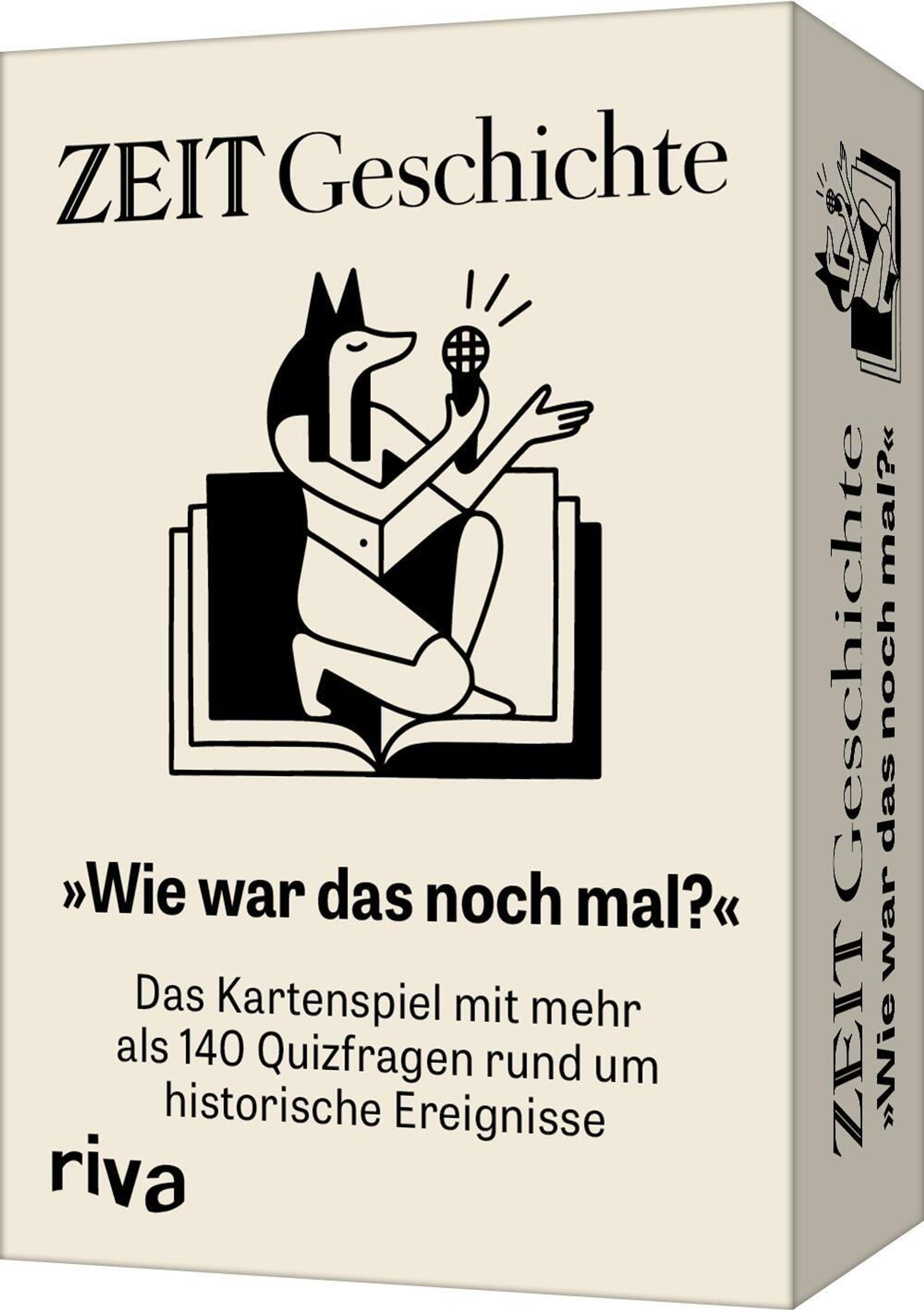 „ZEIT Geschichte“ oben, darunter Anubis mit Mikrofon in einem Buch. Text: „Wie war das noch mal?“ Kartenspiel mit 140 Quizfragen., Diverse