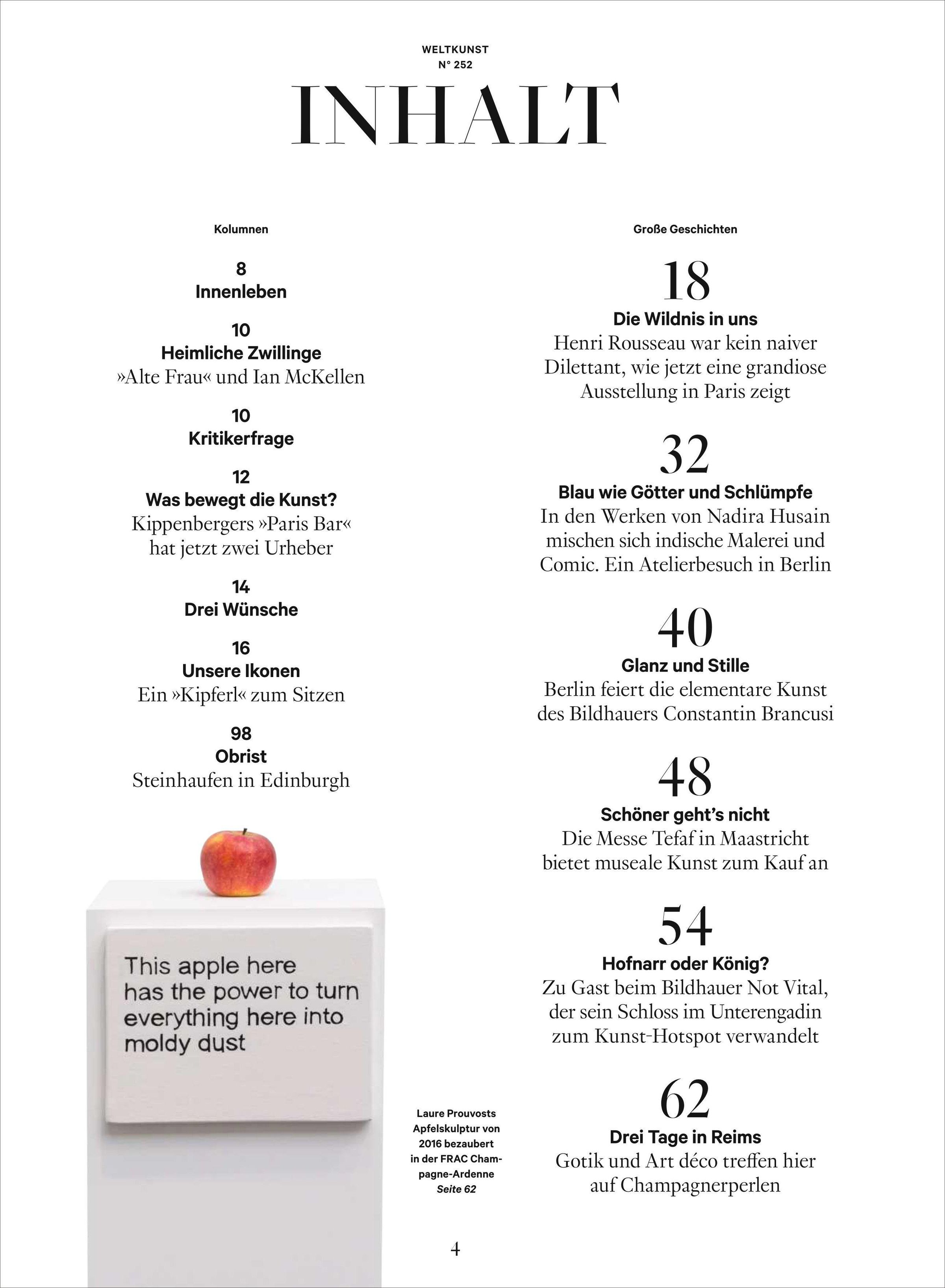* Titelthema: Im Dschungel der Moderne *Blau wie Götter und Schlümpfe: In den Werken von Nadira Husain mischen sich indische Malerei und Comic. Ein Atelierbesuch in Berlin. * Glanz und Stille: Berlin feiert die elementare Kunst des Bildhauers Constantin Brancusi. * Schöner geht's nicht: Die Messe Tefaf in Maastricht bietet museale Kunst zum Kauf an. * Hofnarr oder König? Zu Gast beim Bildhauer Not Vital, der sein Schloss im Unterengadin zum Kunst-Hotspot verwandelt.