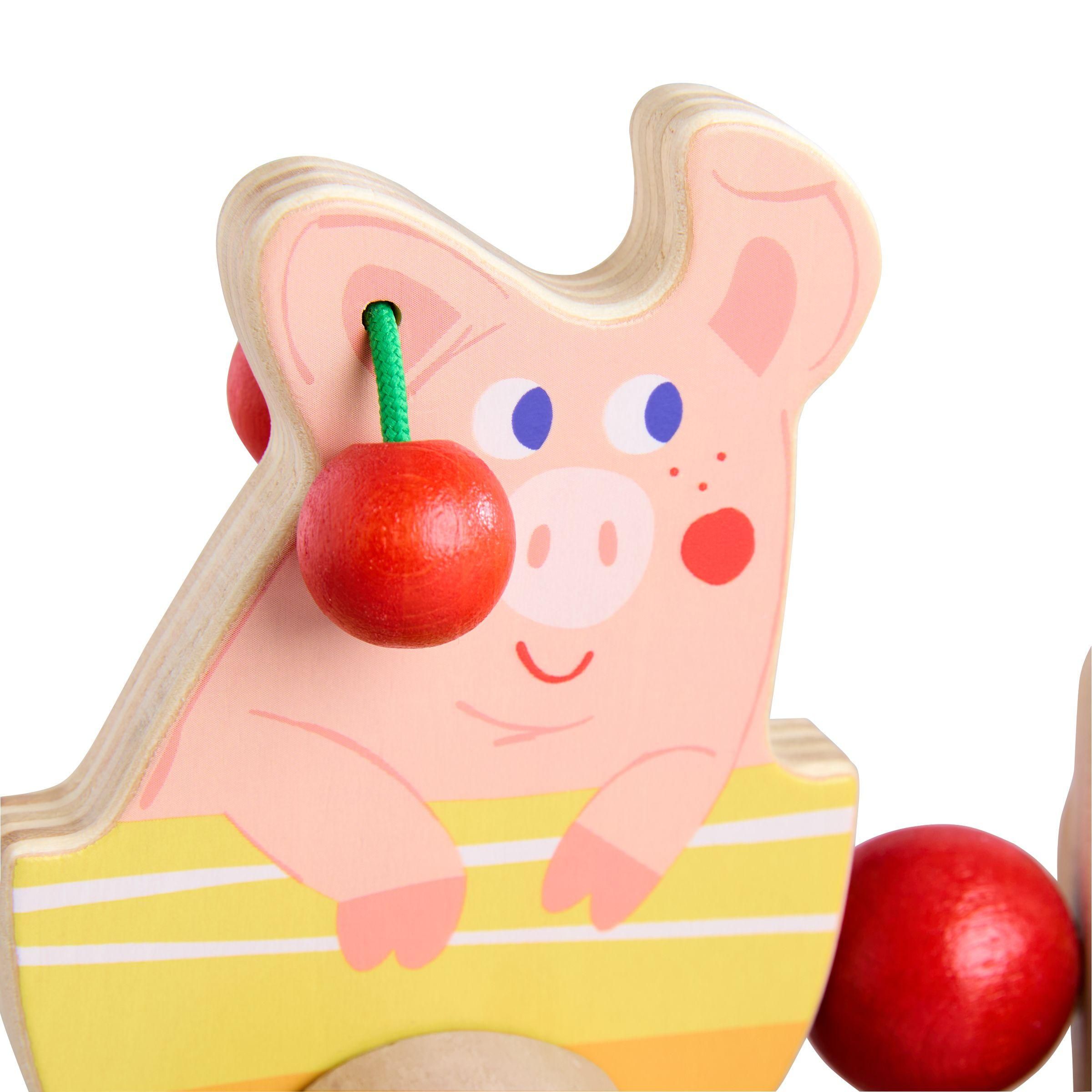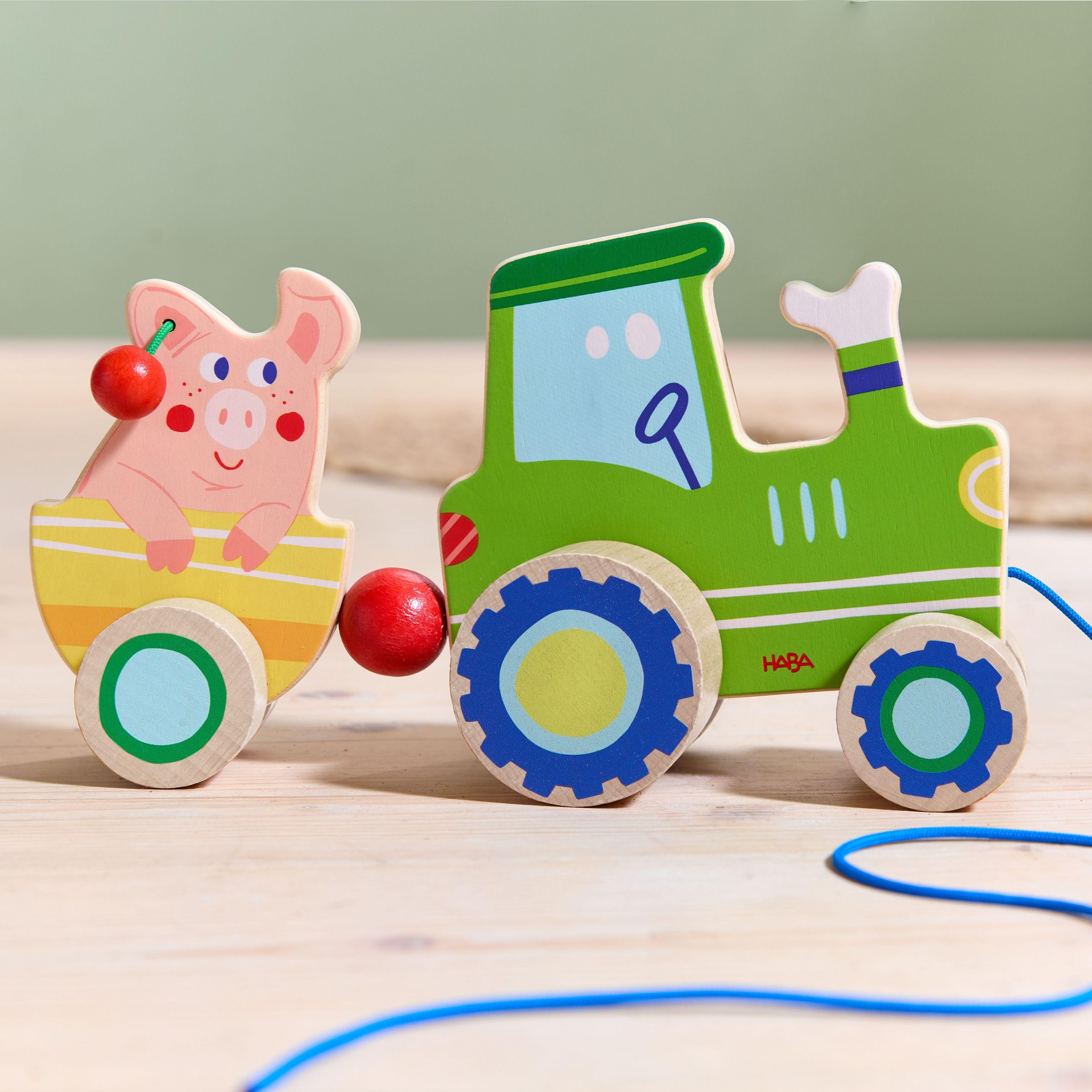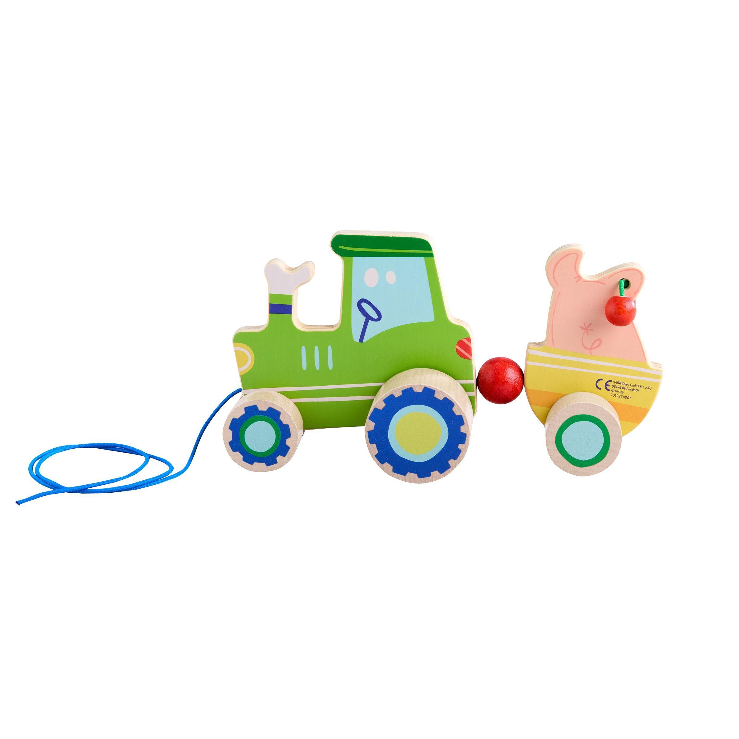 Ein Traktor kommt selten allein - dieser hier hat gleich noch ein Schwein im Gepäck. Nanu, was ist das? Die Ohren des kleinen Grunzers sind ja mit Kirschen behangen, die bei Bewegung klackern! Das Nachziehen des Traktors samt Schwein und Hänger regt Kinder zum Krabbeln und Laufen an. Und auch Zugucken macht Spaß: Der Hänger wackelt beim Ziehen und hoppelt lustig auf und ab!