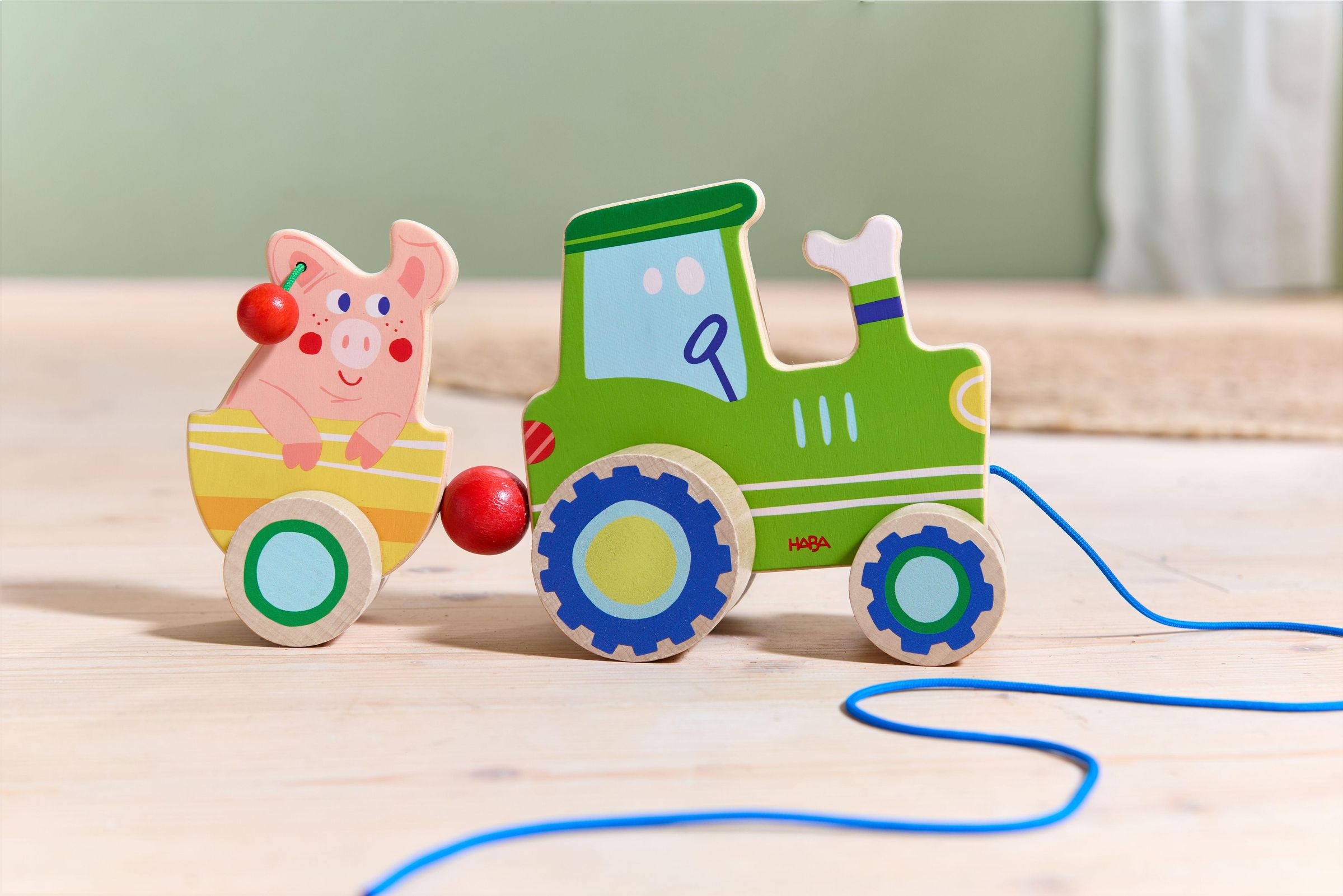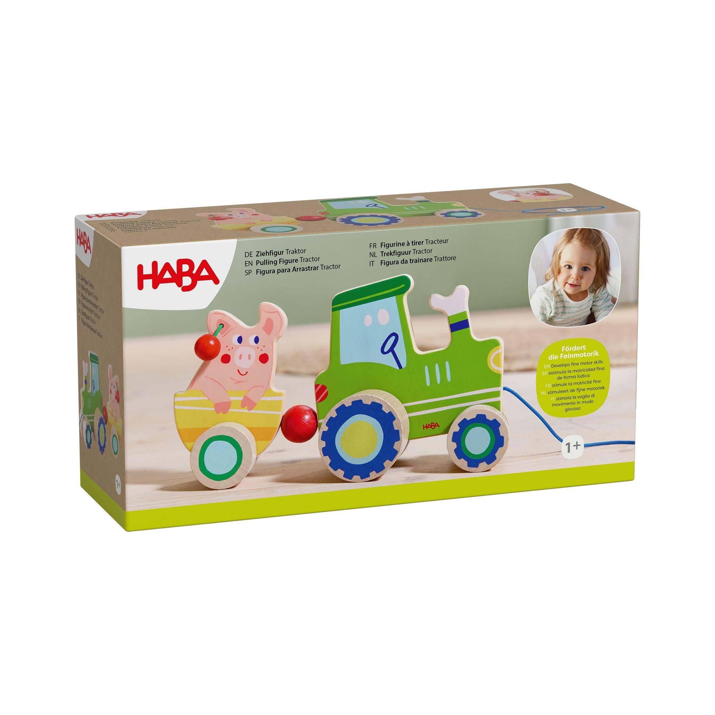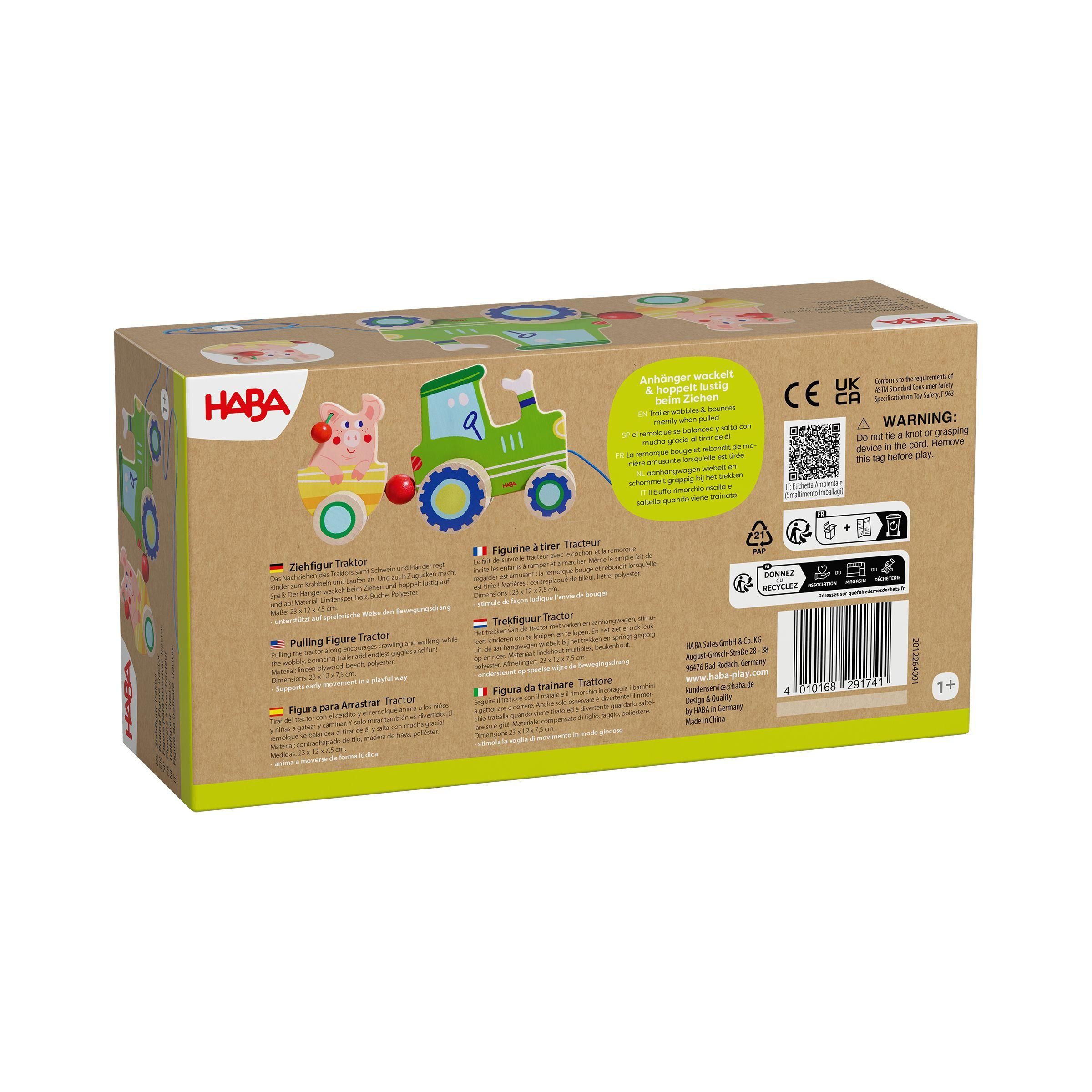 Ein Traktor kommt selten allein - dieser hier hat gleich noch ein Schwein im Gepäck. Nanu, was ist das? Die Ohren des kleinen Grunzers sind ja mit Kirschen behangen, die bei Bewegung klackern! Das Nachziehen des Traktors samt Schwein und Hänger regt Kinder zum Krabbeln und Laufen an. Und auch Zugucken macht Spaß: Der Hänger wackelt beim Ziehen und hoppelt lustig auf und ab!
