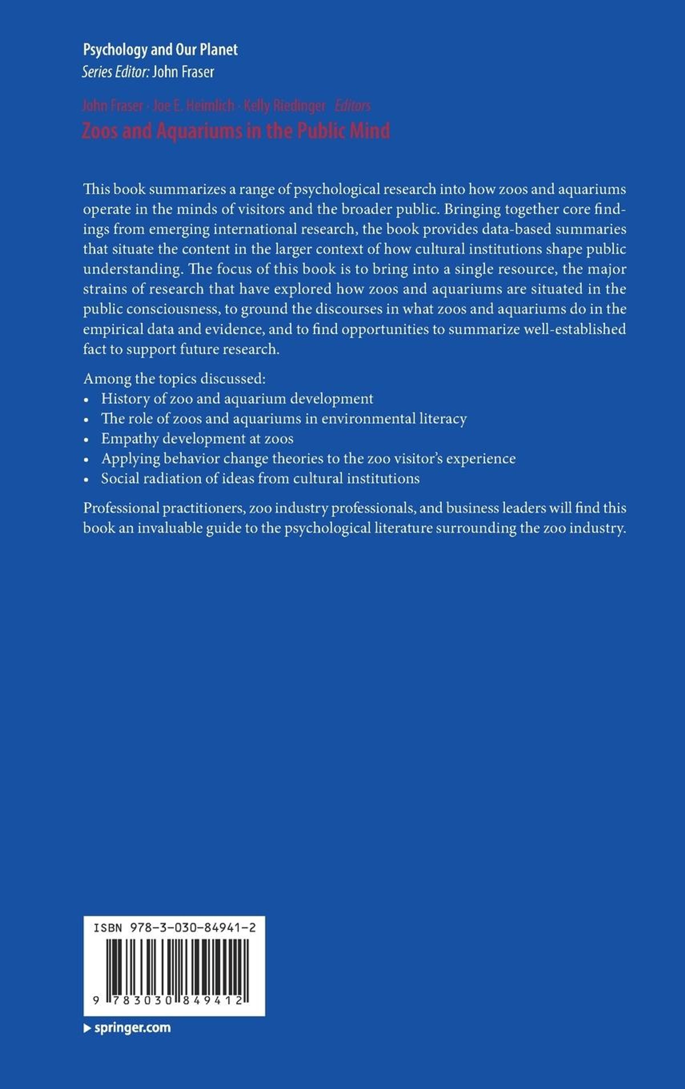 Foreword.- 1. Established facts about how zoos and aquariums work in mental process.- 2. Trust and favorability.- 3. What is the STEM learning ecology and where do zoos and aquariums fit in it? Insights from a National Study of the Public's Engagement with Science, Technology, Engineering, and Math.- 4. Basics of behavior change.- 5. Family talk at Live Animal Exhibits: From Biological to Ecological to Conservation Talk.- 6. Critical environmental literacy and the role of zoos and aquariums: A Radical Proposition.- 7. Can we nudge them? Conservation talk under different interpretive conditions.- 8. Social radiation of ideas from cultural institutions.- 9. Visitor behavior, choice, conservation conversations and meaning-making: Tracking visitor groups with GoPro Cameras.- 10. Visitor agendas and preconceptions about learning.- 11. Empathy development at zoos.- 12. Contributions to biodiversity awareness: An update on achieving Aichi target 1.