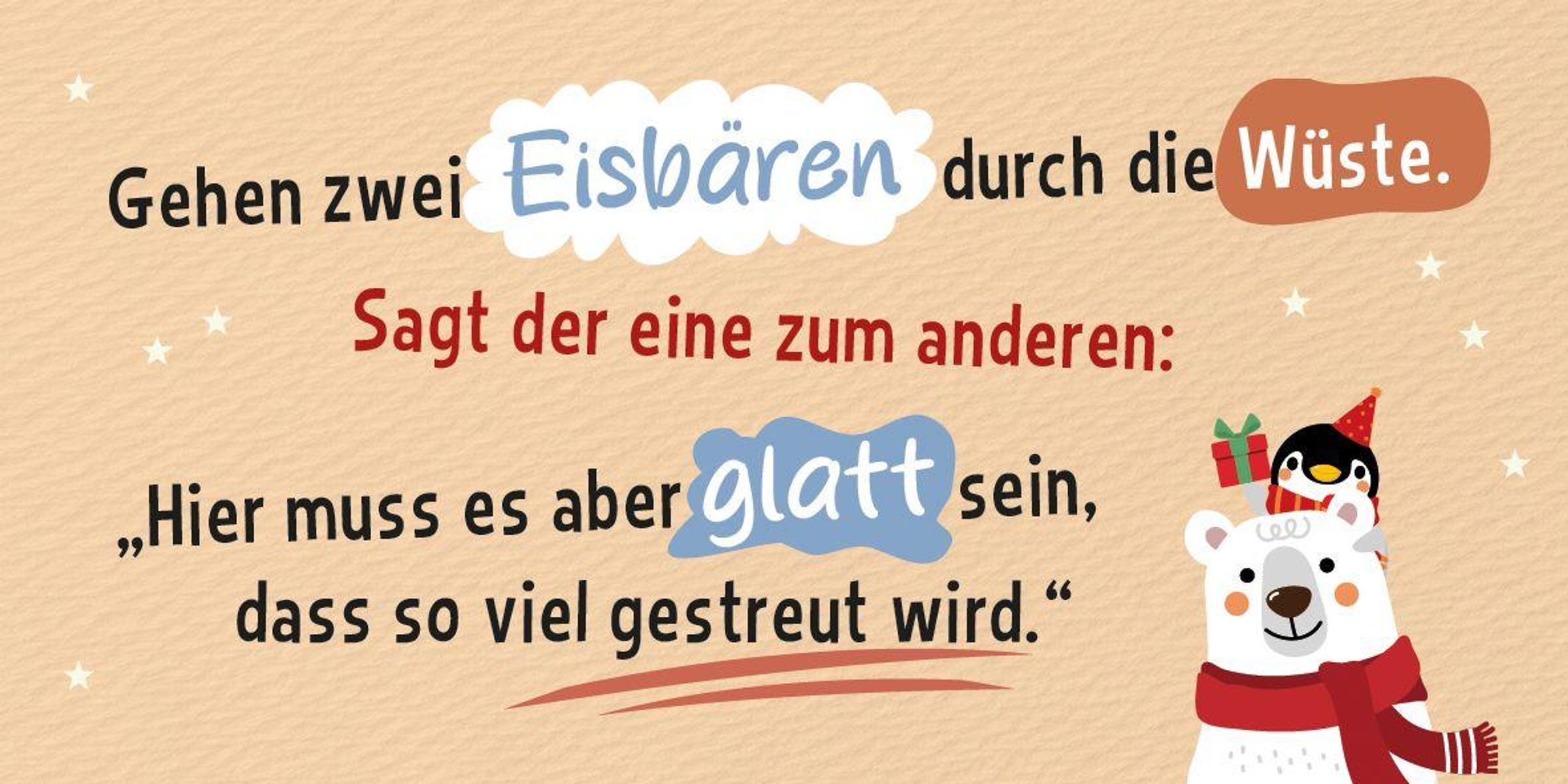 'Gehen zwei Eisbären durch die Wüste. Sagt der eine zum anderen: ¿Hier muss es aber glatt sein, dass so viel gestreut wird. ¿' Die kurzen Witze und Scherzfragen begleiten durch den Advent und sorgen immer für gute Laune. Das Witzebüchlein ist aufgrund der leicht lesbaren Schrift und den lustigen Illustrationen bereits für die Kleinsten geeignet. Die heraustrennbaren Seiten lassen sich ideal zum Befüllen eines selbstgemachten Adventkalenders und als weihnachtliche Überraschung für zwischendurch verwenden. Die Witzesammlung passt perfekt als kleines Geschenk in den Nikolausstiefel oder unter den Weihnachtsbaum.