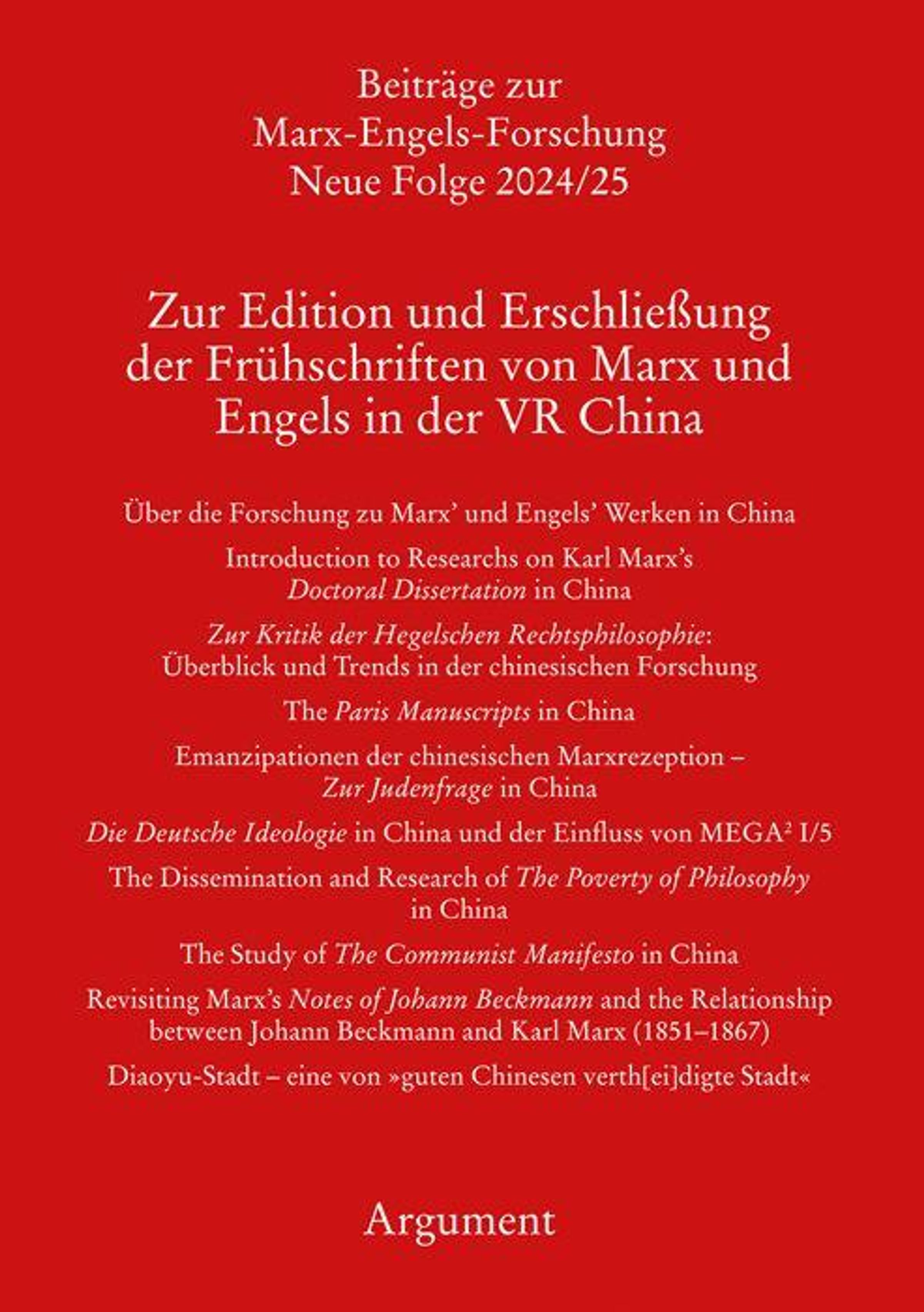 Die Aufsätze spiegeln eine lebendige Debatte um die Marx'schen Frühschriften bis zum Erscheinen des Kommunistischen Manifests. Was auffällt, ist die Suche nach einer genuin chinesischen Auslegung der Texte von Marx und Engels in Verbindung mit aktuellen Diskussionen um die Anwendbarkeit des Marxismus auf China im 21. Jahrhundert. In jedem Beitrag ist die chinesische Rezeptionsgeschichte eines frühen Werks von Marx bzw. Engels dargestellt.