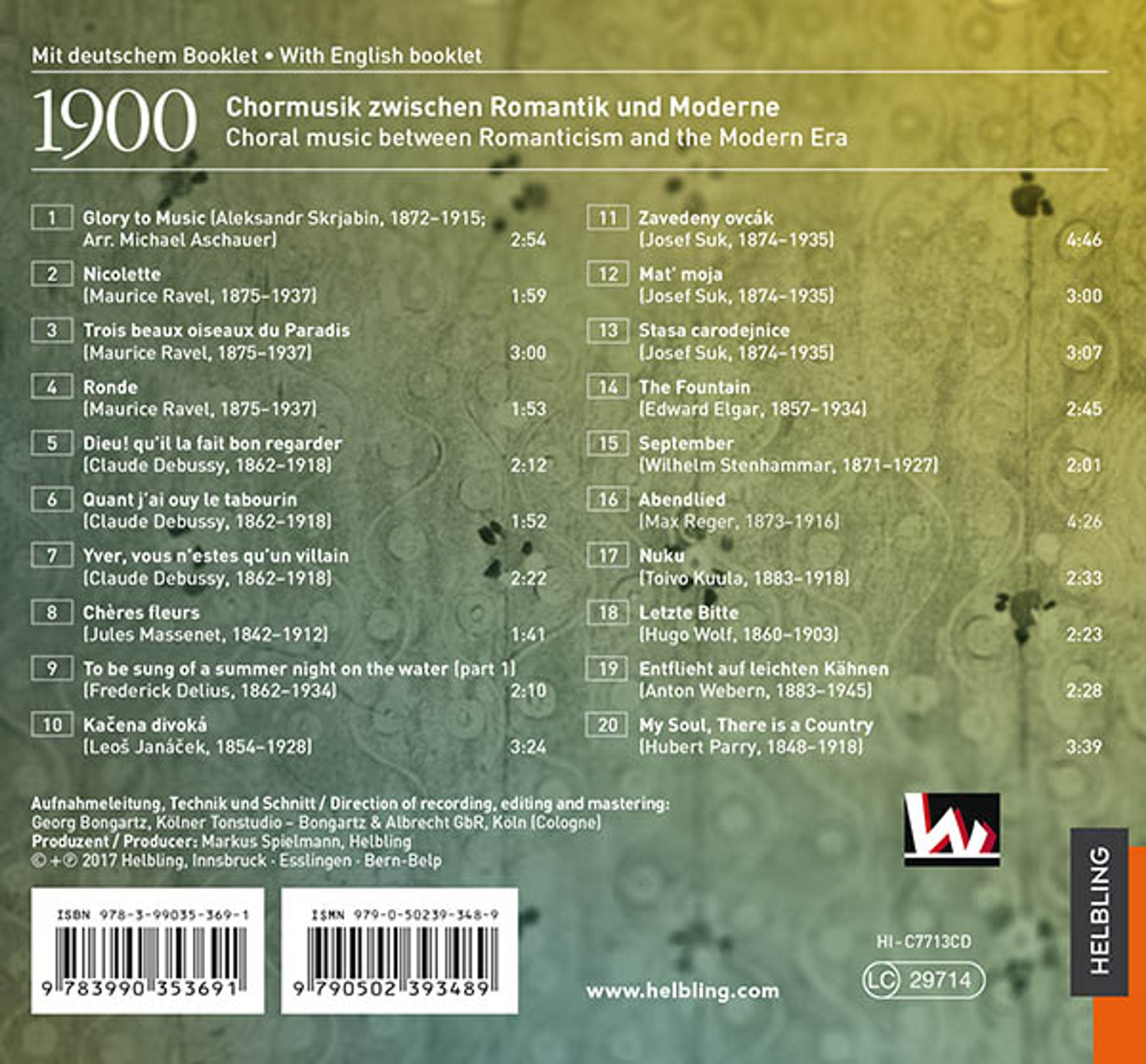 Die Wende vom 19. zum 20. Jahrhundert ist gekennzeichnet durch zahlreiche Umwälzungen in gesellschaftspolitischer, sozialhistorischer und künstlerischer Hinsicht. Auch auf musikalischem Sektor macht sich entscheidend Neues breit, während die alten Ideale zugleich noch lange Zeit weiter gepflegt werden. Ein faszinierendes stilistisches Nebeneinander im Spannungsfeld von Romantik, Moderne, Impressionismus und Nationalen Schulen ist die Folge, und diese Vielfalt zeigt sich auch in der vorliegenden Auswahl an Chorwerken aus weiten Teilen Europas, die der Wiener Kammerchor auf dieser neuen CD in einfühlsamen, kraftvollen Interpretationen präsentiert. Quasi als Motto ist zu Beginn Aleksandr Skrjabins exakt 1900 entstandene Hymne an die Kunst vorangestellt – eine A-cappella-Bearbeitung des Schlusschors aus seiner ersten Symphonie. Danach folgt eine beeindruckende Kombination aus Highlights wie Maurice Ravels und Claude Debussys Trois chansons, Max Regers Abendlied oder Hubert Parrys My Soul, There is a Country und neu zu entdeckende Juwelen wie das eindringliche Nuku (Schlafe), komponiert vom auf tragische Weise viel zu früh verstorbenen Finnen Toivo Kuula, oder die zupackenden Drei Gesänge op. 19 des tschechischen Komponisten Josef Suk.