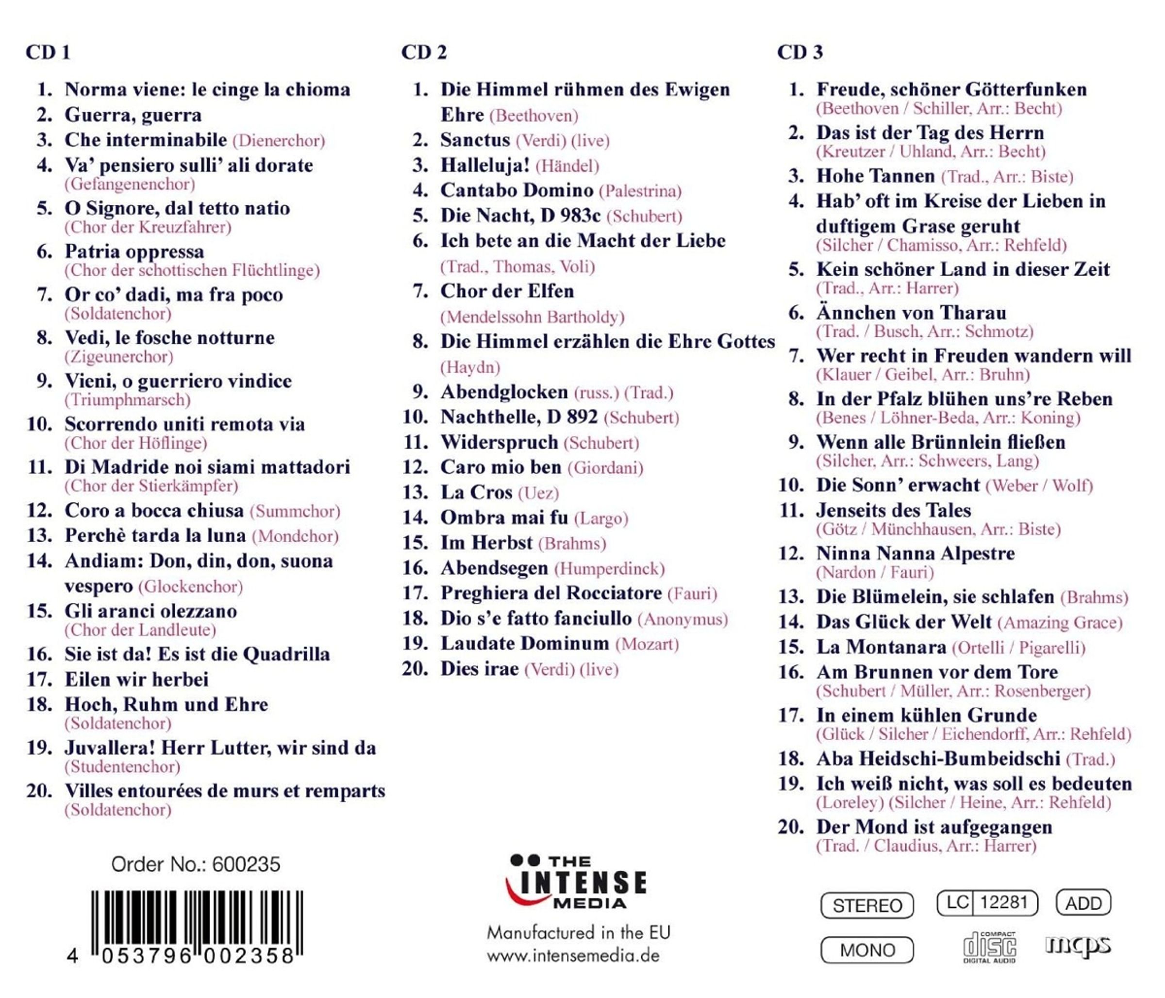 Chöre von Bellini, Verdi, Puccini, Leoncavallo, Bizet, Mascagni, Beethoven, Schubert, Palestrina, Giordani, Händel, Brahms, Humperdinck, Fauri, Anonymus, Mozart u. a.