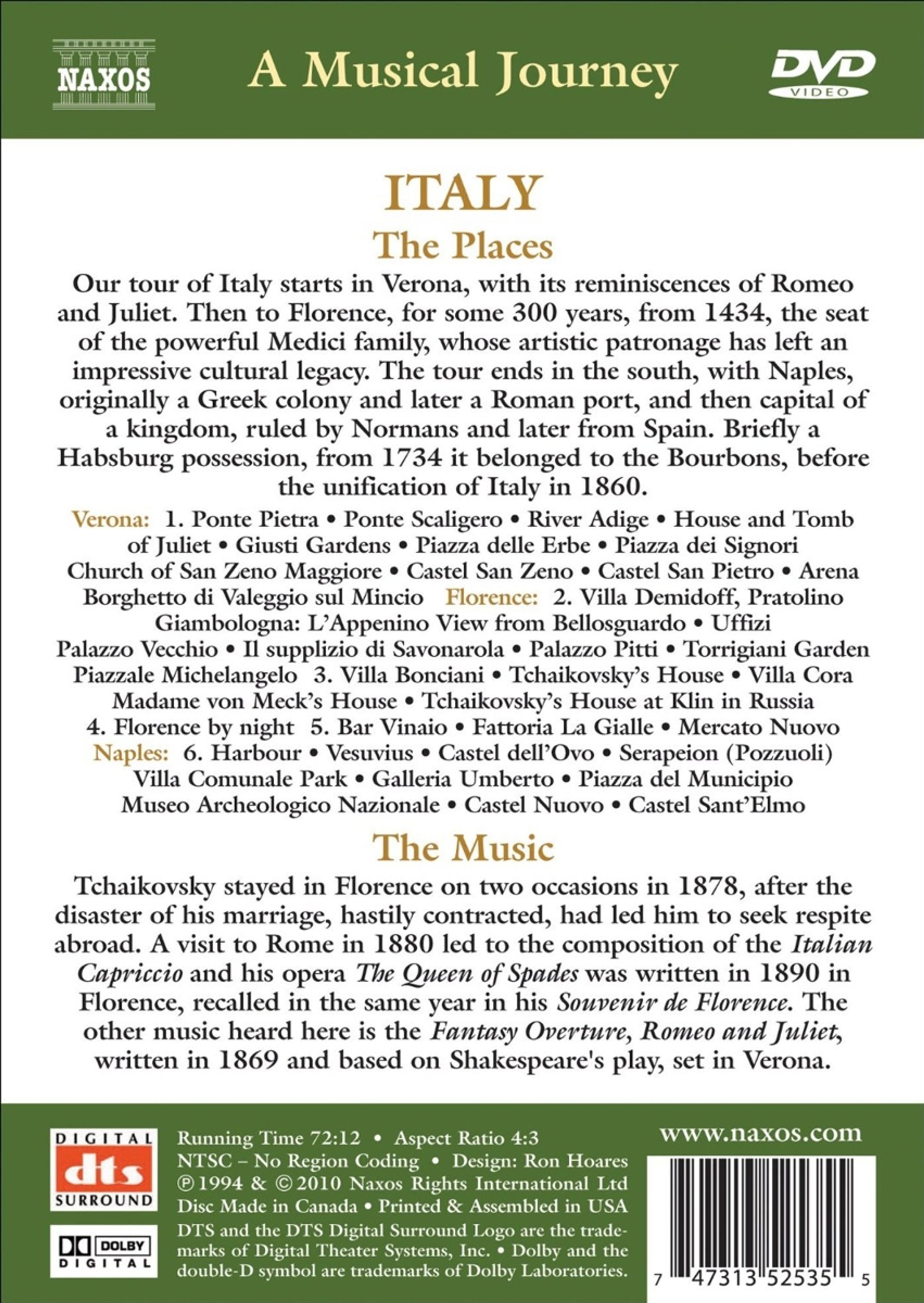 Tschaikowsky hielt sich 1878 zweimal in Florenz auf, nachdem ihn das Desaster seiner überstürzt geschlossenen Ehe dazu veranlasst hatte, im Ausland Zuflucht zu suchen. Ein Besuch in Rom im Jahr 1880 führte zur Komposition des italienischen Capriccios und seine Oper Pique Dame entstand 1890 in Florenz und wird im selben Jahr in seinem Souvenir de Florence erwähnt. Die andere hier zu hörende Musik ist die Fantasie-Ouvertüre »Romeo und Julia«, die 1869 geschrieben wurde und auf Shakespeares in Verona spielendem Stück basiert.