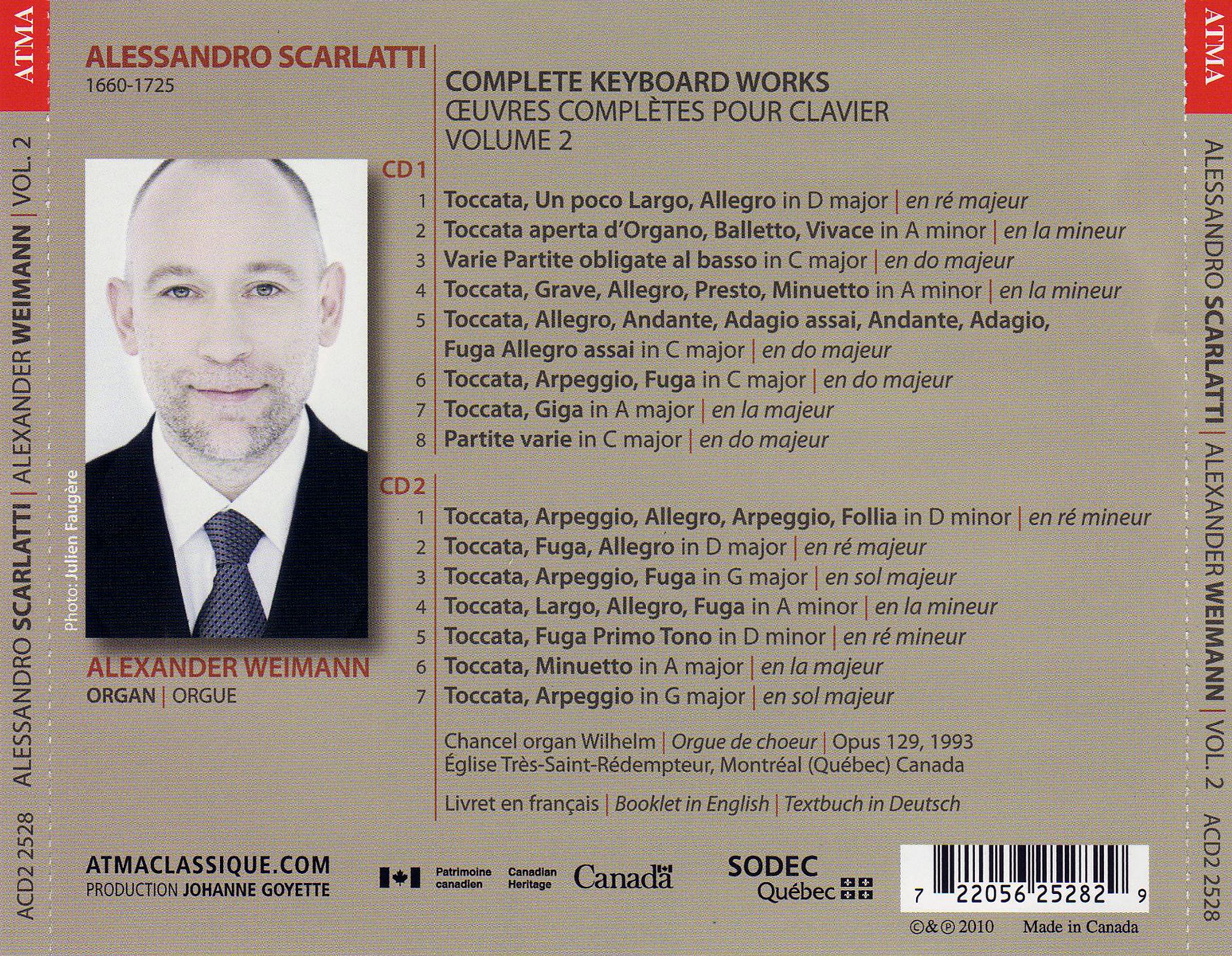 Anlässlich des 350. Geburtstages von Alessandro Scarlatti führt Alexander Weimann sein gesamtes Klavierwerk dieses großen italienischen Komponisten des Barock fort. Sein Werk umfasst rund dreißig Toccaten und verschiedene Variationen. Diese Partituren werden heute in den Sammlungen mehrerer Bibliotheken in Europa und sogar in Nordamerika aufbewahrt und einige dieser Werke werden zum ersten Mal auf CD präsentiert.