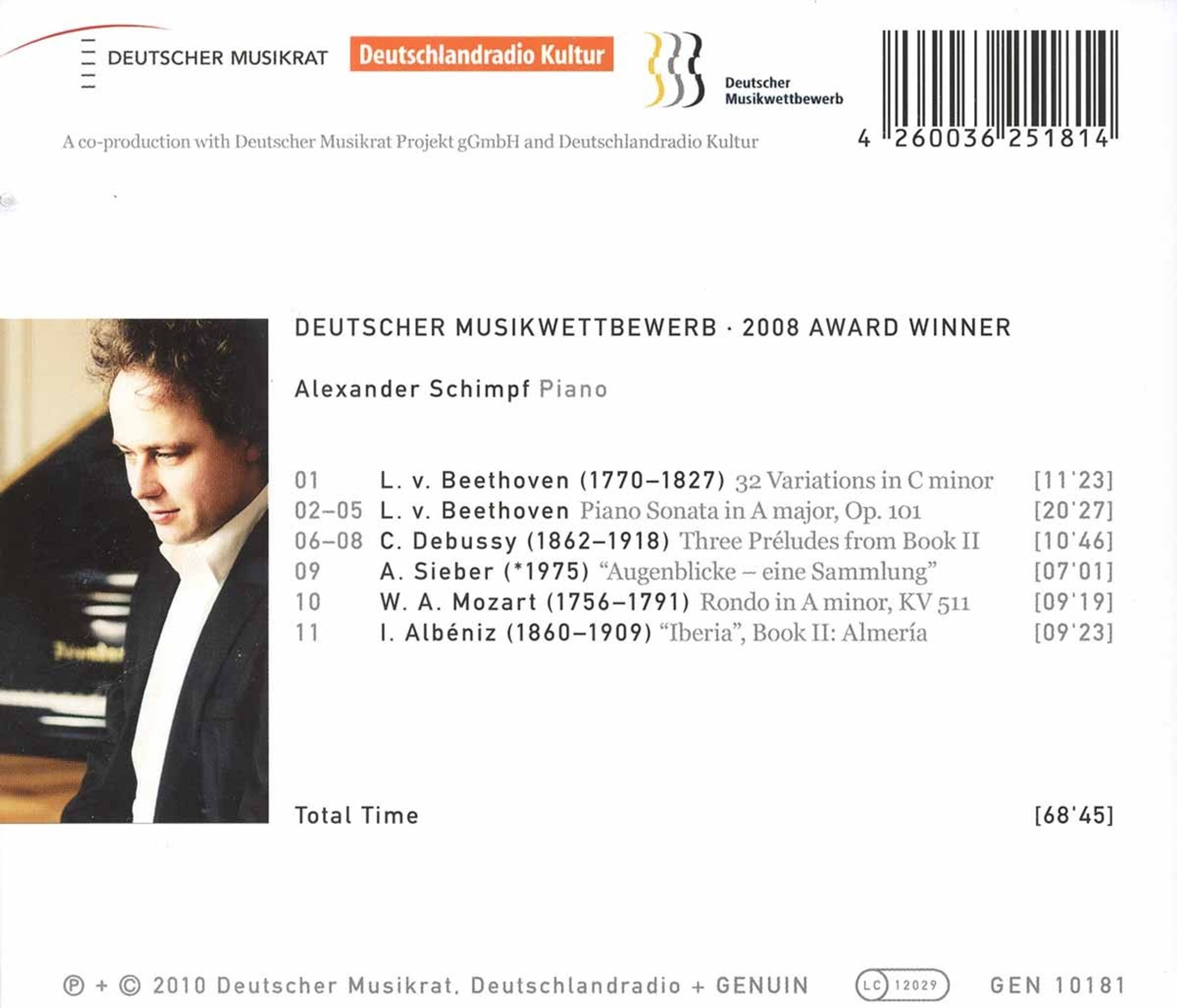 Dass Alexander Schimpf Gewinner des Deutschen Musikwettbewerbs 2008 ist, beeindruckt. Dass er den Beethoven-Wettbewerb 2009 in Wien siegte, ist ebenfalls erwähnenswert.