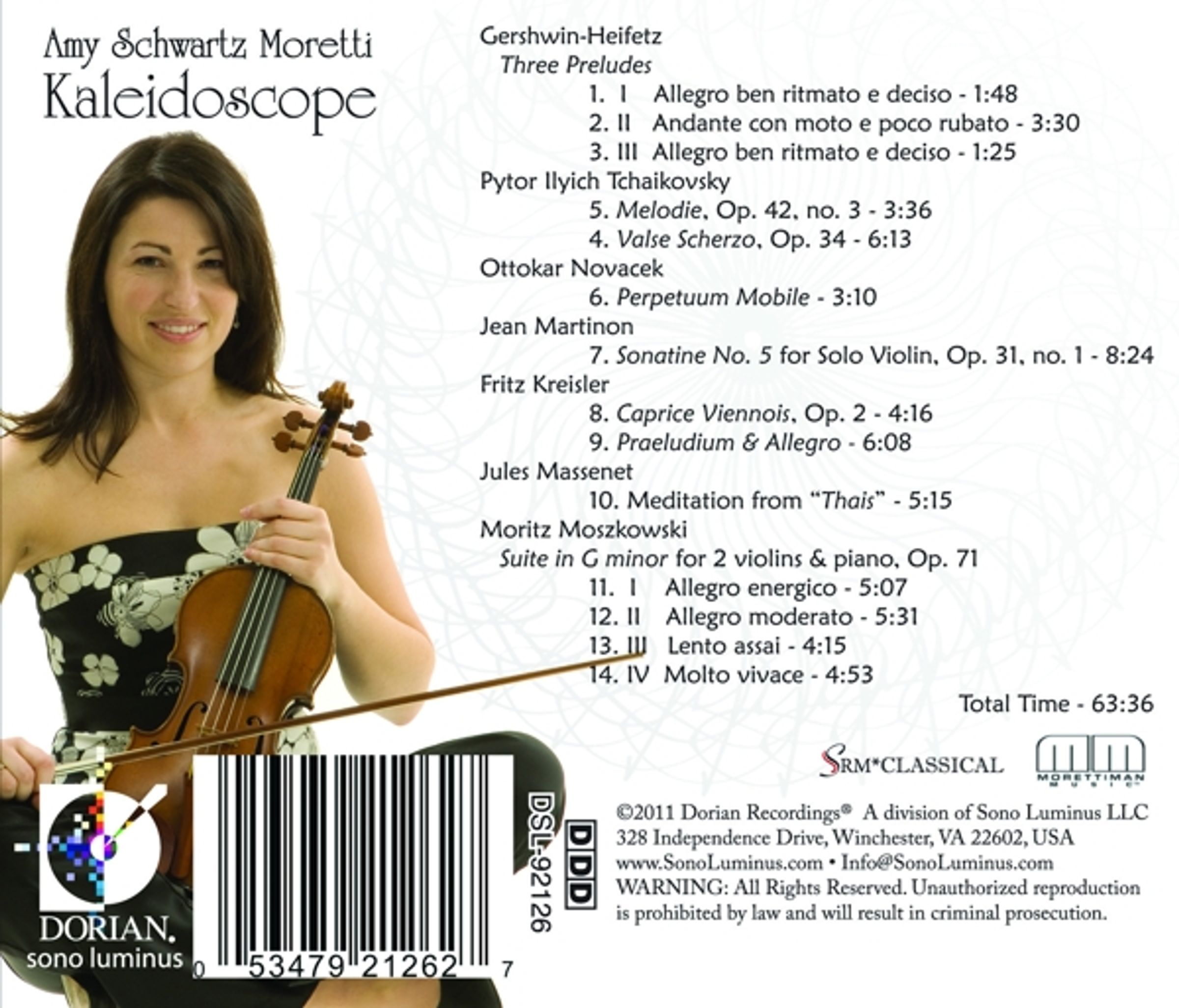 Wenn es um die musikalische Eleganz und Grazie ihres Spiels geht, übertreffen sich die Rezensenten in ihrer Wortwahl. So bezeichnete die St. Petersburger Times das Spiel von Amy Schwartz Moretti als „atemberaubend ausdrucksreich in Klang und Farbe“ und der Rezensent des The Oregonian empfand „ein Konzert, das von einer inneren Wärme glühte“. Für die CD Kaleidoscope hat Amy Schwartz Moretti sich die Stücke ausgesucht, die sie ihr ganzes Leben begleitet haben und die mit Ihr während der Jahre des Geigespielens mitgewachsen sind. Mit Elisabeth Pridgen am Klavier und Robert McDuffie an der zweiten Violine stehen ihr zwei großartige Kollegen bei diesem Projekt zur Seite.