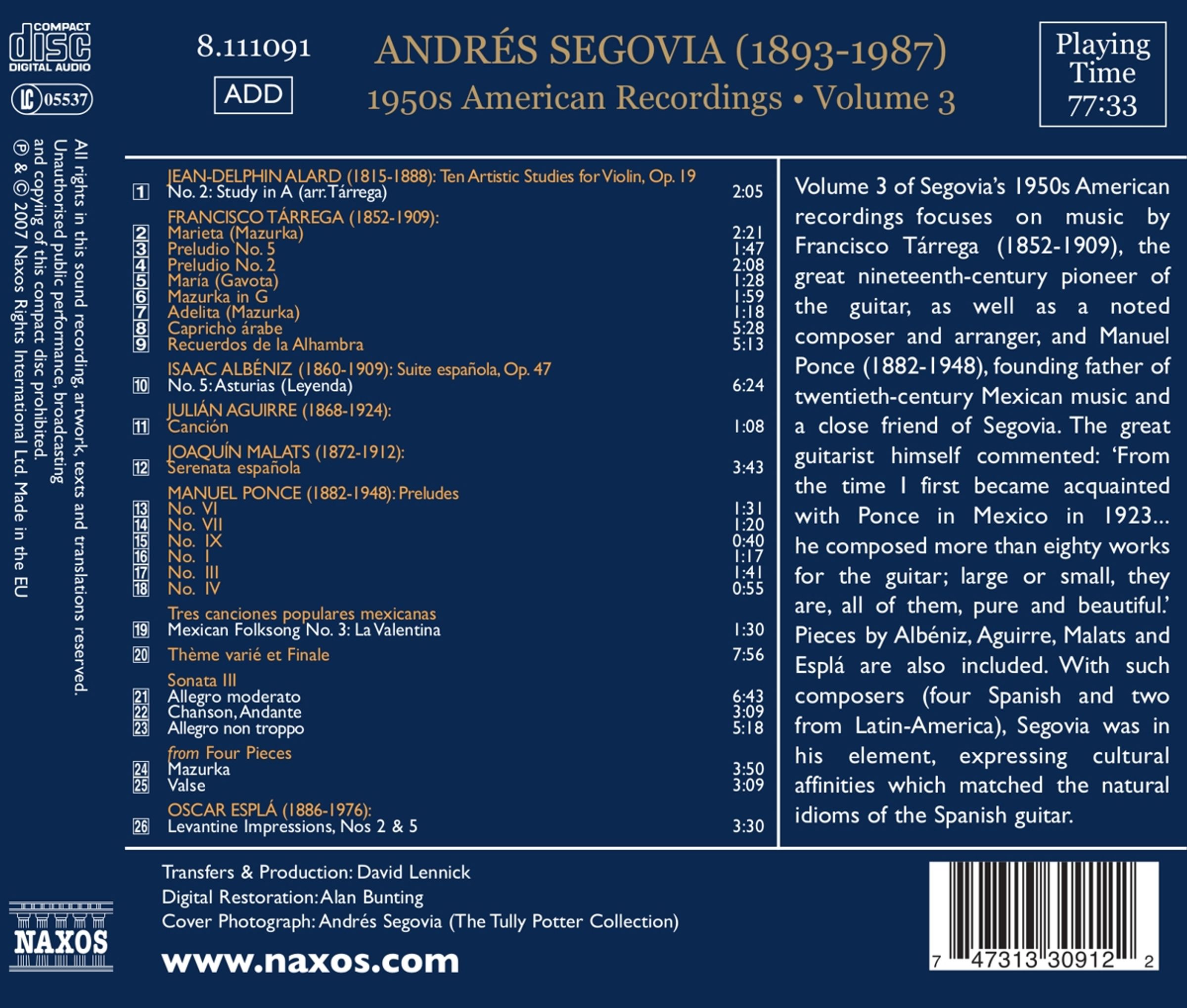 Volume 3 of Segovia's 1950s American recordings focuses on music by Francisco Tárrega (1852-1909), the great nineteenth-century pioneer of the guitar, as well as a noted composer and arranger, and Manuel Ponce (1882-1948), founding father of twentieth-century Mexican music and a close friend of Segovia. The great guitarist himself commented: 'From the time I first became acquainted with Ponce in Mexico in 1923... he composed more than eighty works for the guitar; large or small, they are, all of them, pure and beautiful.' Pieces by Albéniz, Aguirre, Malats and Esplá are also included. With such composers (four Spanish and two from Latin-America), Segovia was in his element, expressing cultural affinities which matched the natural idioms of the Spanish guitar.