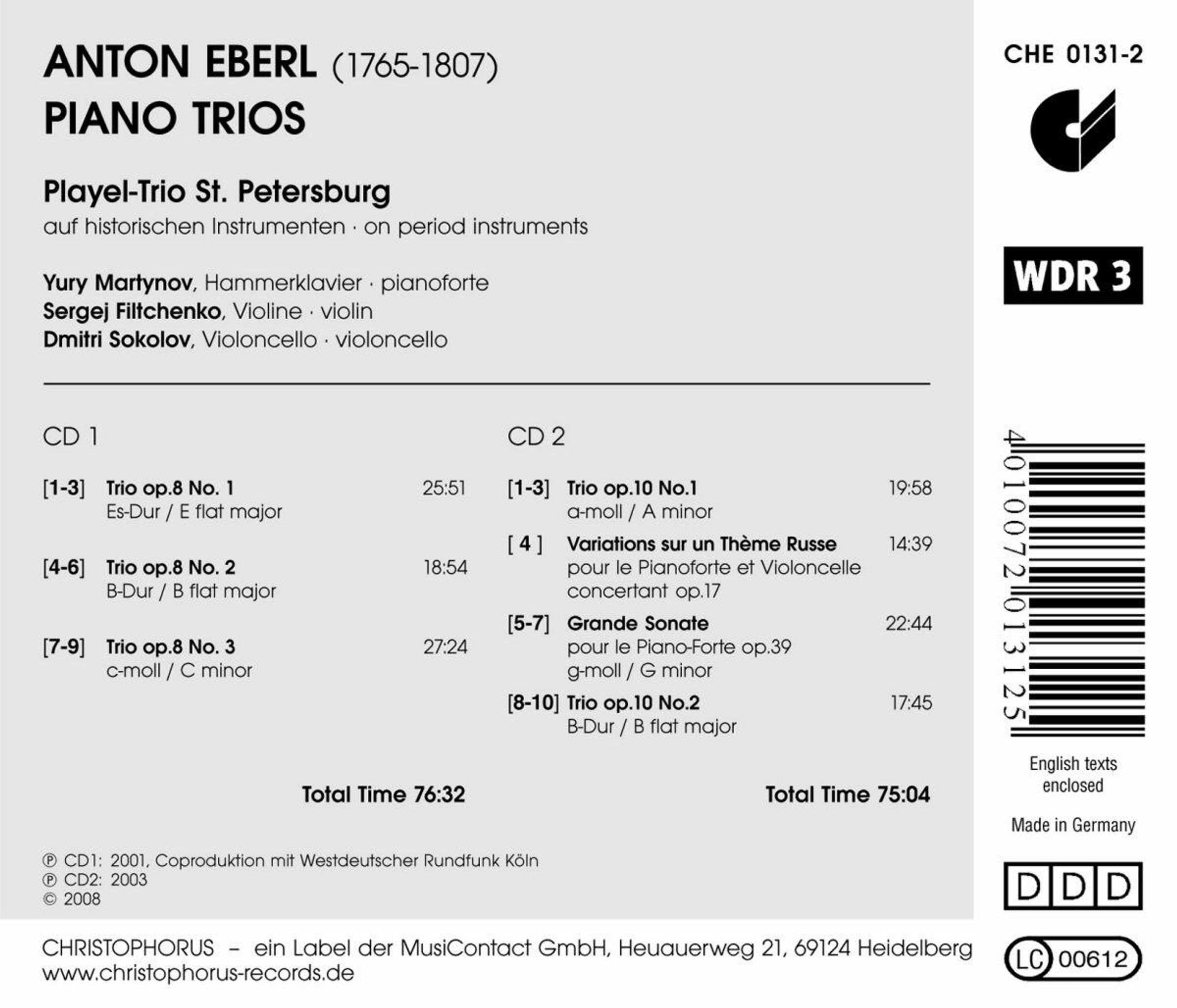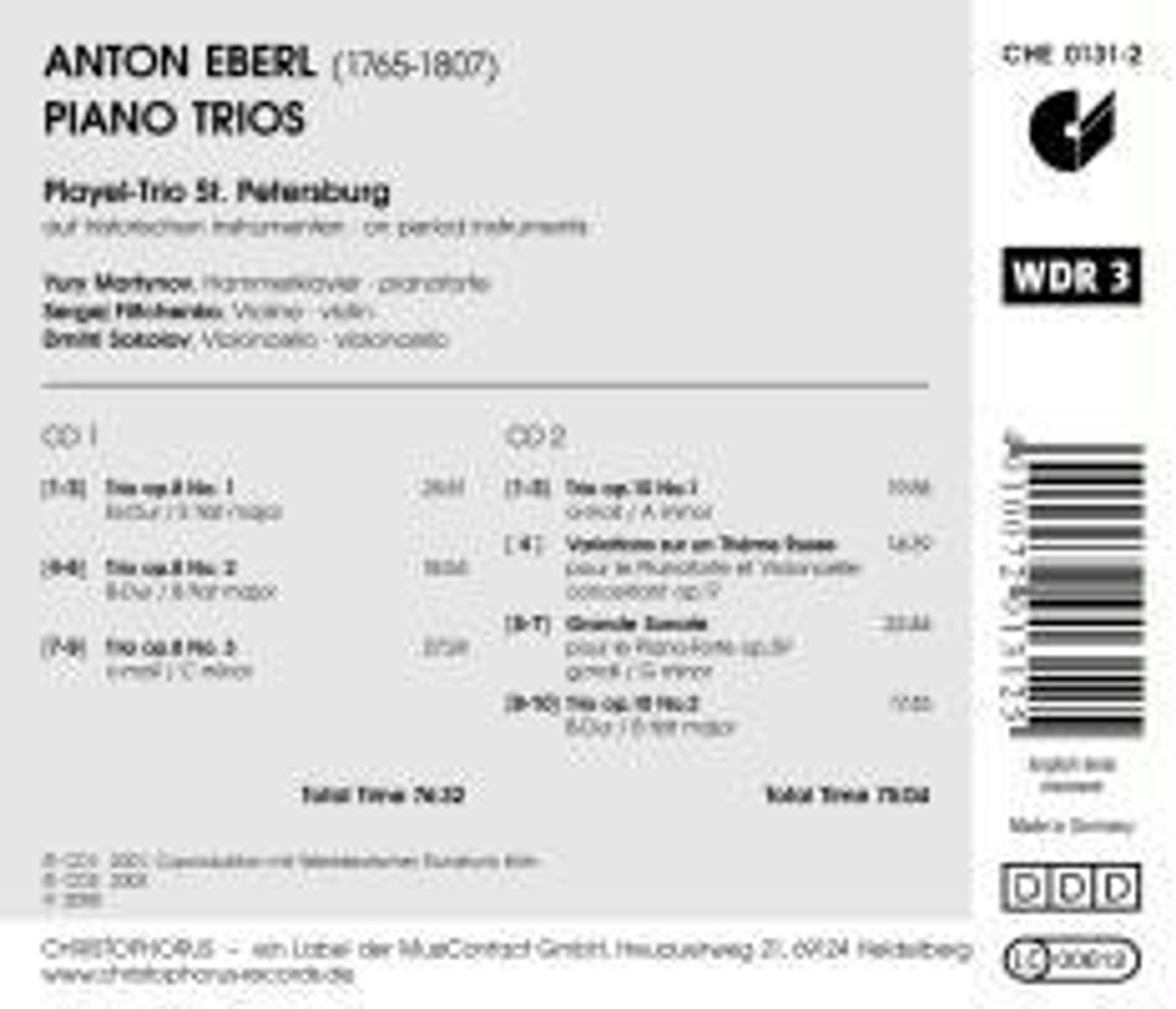 Die Wiederentdeckung der lange vernachlässigten Zeitgenossen Haydns, Mozarts und Beethovens ist noch lange nicht abgeschlossen. In jüngster Zeit bot das russische Playel-Trio St. Petersburg Gelegenheit, einige Kammermusikwerke des Wiener Komponisten Anton Eberl (1765-1807) zu entdecken, der sich immerhin der besonderen Wertschätzung Mozarts als Schüler und Freund erfreute. Während eines mehrjährigen Aufenthaltes in St. Petersburg konnte sich seine Musik stilistisch vom Vorbild Mozarts emanzipieren. Nach seiner Rückkehr nach Wien verstarb Eberl auf dem Höhepunkt seines Ruhmes unerwartet an einer Blutvergiftung.