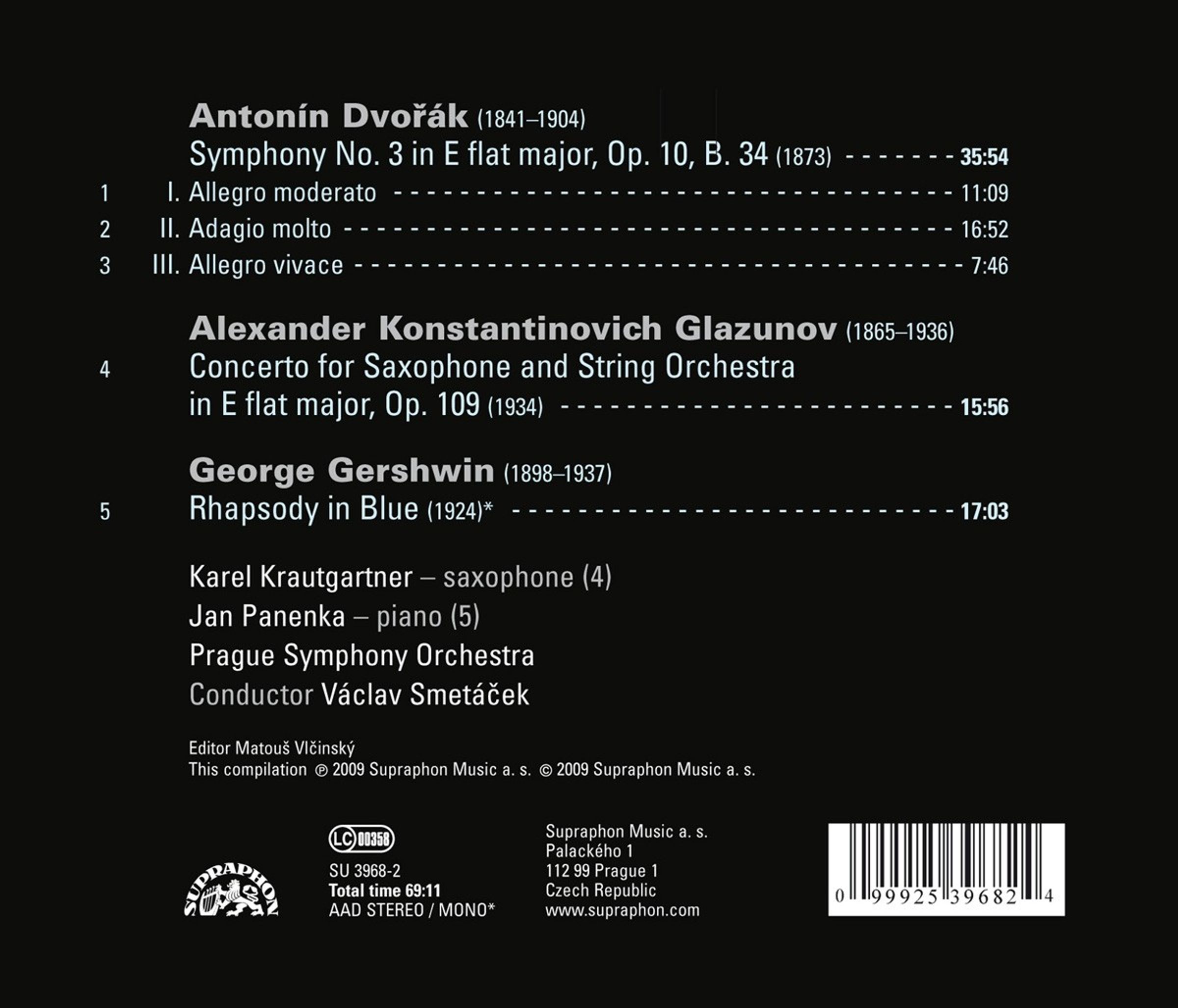 Dvorak - Glazunov - Gershwin. With a touch of hyperbole, this combination of seemingly disparate music worlds can be conceived as a comparison of the reverberations of Slavonic musicality in various corners of the world. Dvorak's Symphony No. 3 abounds with "Slavonic" melodiousness and pathos. Glazunov was inspired by the mastery of the American saxophonist Sigurd Rascher, yet in terms of style he remained in the domain of the Romantic concerto, without being influenced by the jazz conquering North America at the time. George Gershwin, a composer seemingly distant from the Slavonic world, hailed from a family of Russian emigres and, in addition, had to square up to the legacy of Antonin Dvorak, whose pedagogic work in the USA markedly influenced several generations of composers. The common denominator of these recordings is the personality of Vaclav Smetacek, to whom the Prague Symphony Orchestra is indebted for its worldwide renown. Smetacek's peerless recording of Dvorak's third symphony contained on this CD is supplemented by superb performances of the pianist Jan Panenka and the jazzman, conductor and composer Karel Krautgartner.