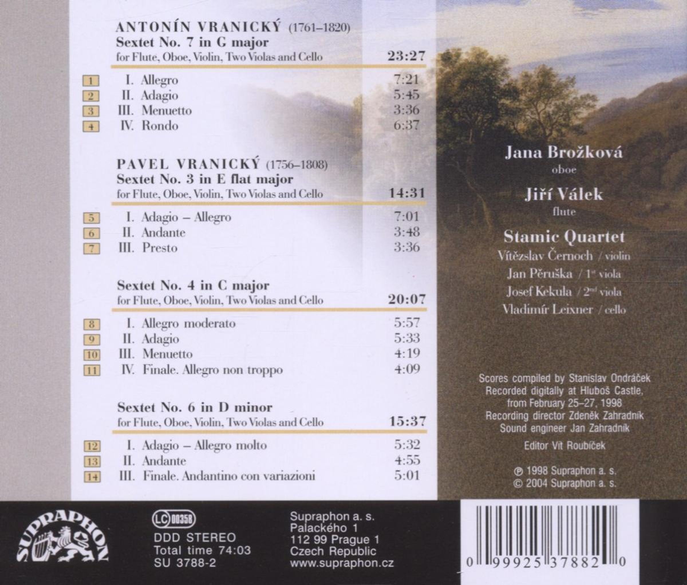 Supraphon presents outstanding chamber music with this premiere digital recording of four sextets for flute, oboe and string quartet, three by Pavel Vranicky (1756-1808) and one by his brother Antonin (1761-1820). The Vranicky brothers composed chiefly in Vienna in the late 18th and early 19th centuries. Astute businessmen as well as gifted composers, they were convinced of the necessity of appealing first and foremost to the pampered metropolitan Viennese, and they were experts at it. This recording of their ingenious and listenable sextets features the renowned Stamic Quartet together with the remarkable young oboist Jana Brozkova and the experienced flutist Jiri Valek. Stanislav Ondracek prepared the manuscripts for recording, working with original archive materials.
