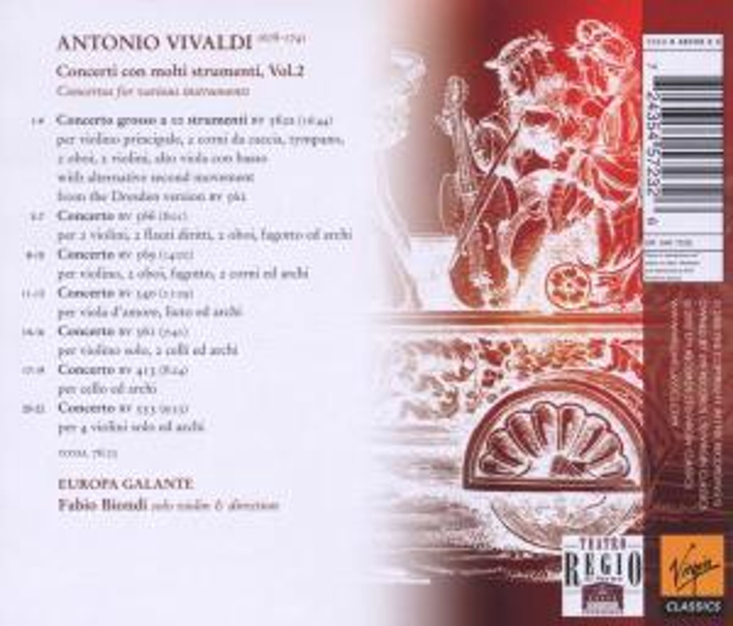 Konzert RV 562a für Violine, 2 Oboen, 2 Hörnern, Pauke; Konzert RV 566 für 2 Violinen, 2 Blockflöten, 2 Oboen, Fagott; Konzert RV 569 für Violine, 2 Oboen, 2 Hörnern, Fagott; Konzert RV 540 für Viola d'amore & Laute; Konzert RV 561 für Violine & 2 Celli; Konzert RV 513 für 2 Violinen