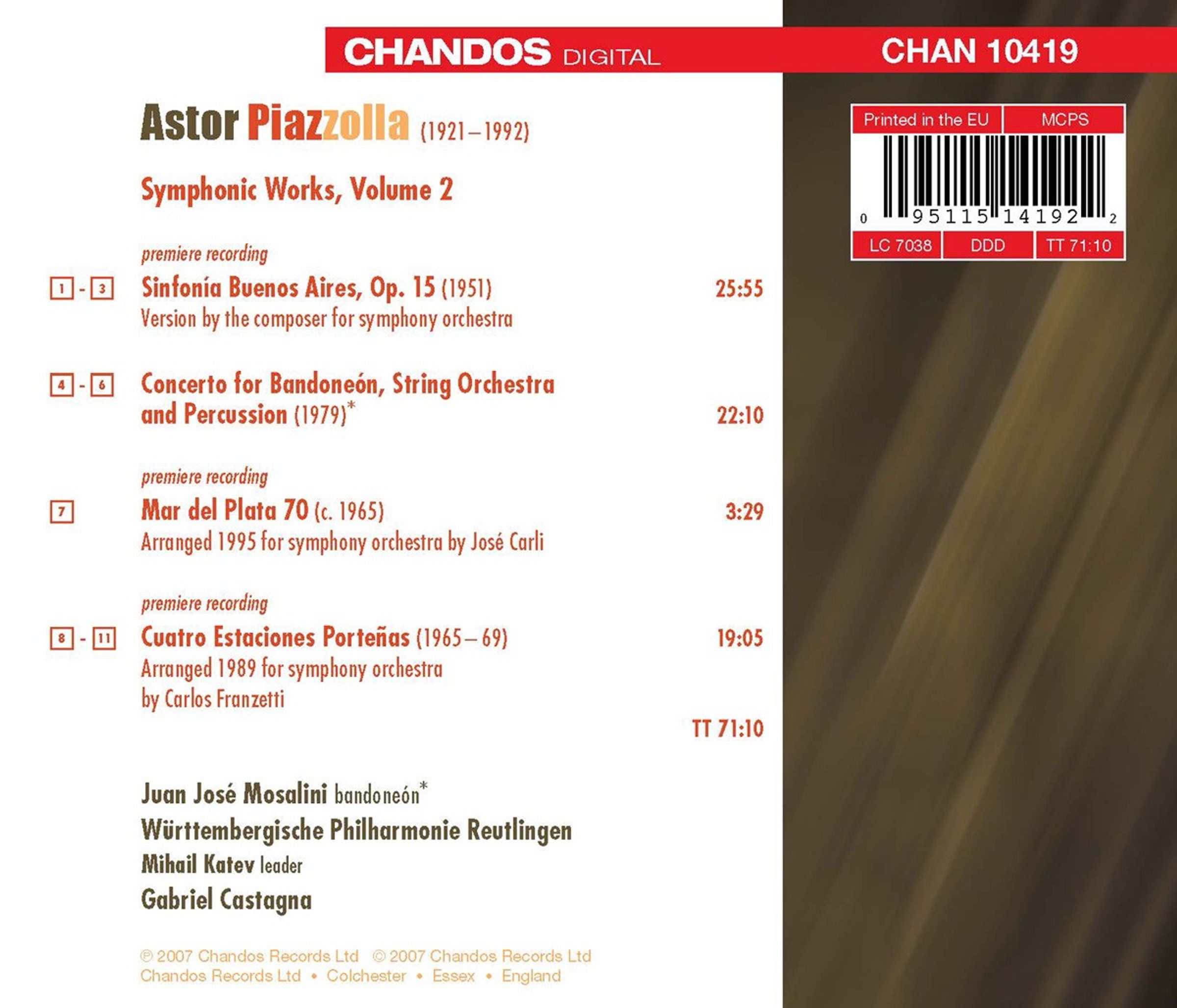 Obwohl der Name Astor Piazzolla meist mit bestimmten Tangos verbunden wird, die bleibenden internationalen Ruhm erworben haben, schrieb Piazzolla neben Tangos u. a. auch Instrumentalkonzerte und sinfonische Werke, die im Mittelpunkt dieser Neuerscheinung stehen. Durch seinen Wagemut und seine intellektuell brillante Herangehensweise konnte er die Merkmale des traditionellen Tango mit frischen, originellen und höchst komplexen musikalischen Formen verbinden.