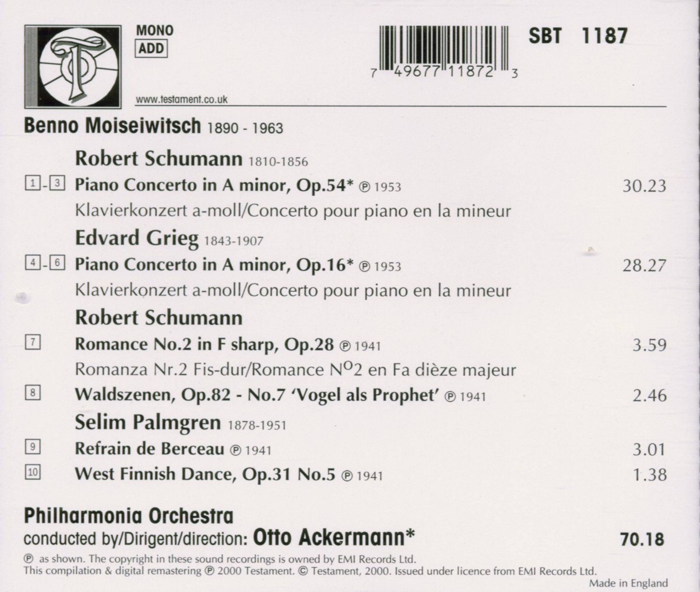 Schumann war Moisewitschs Lieblingskomponist, und nirgends werden seine Fähigkeiten deutlicher als in dessen Klavierkonzert, das hier in der klassischen Kombination mit dem Konzert von Edvard Grieg präsentiert wird.