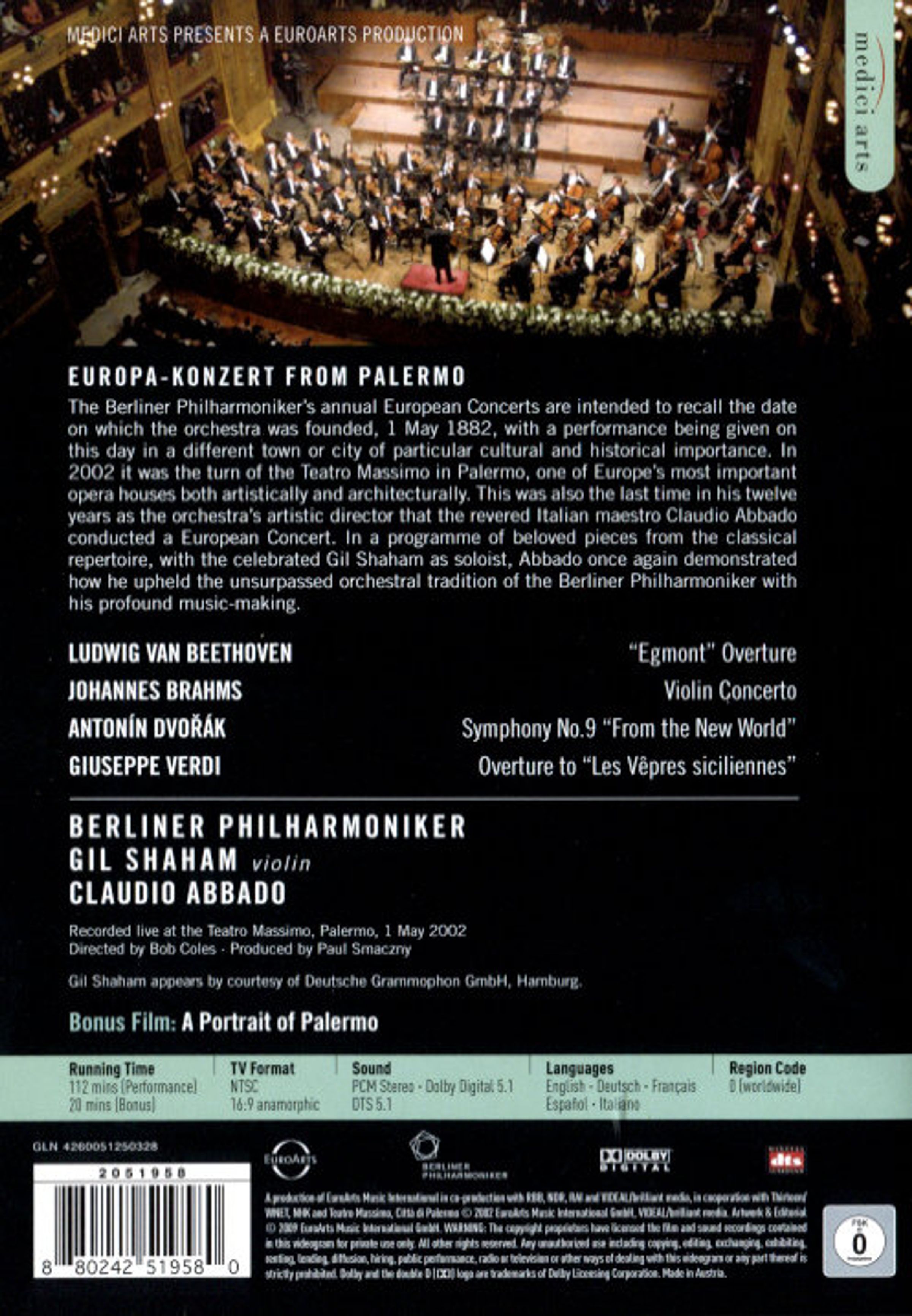 Die äMischung aus Phantasie, Freiheit im Ausdruck und rigoroser Erforschung, die seit jeher für die Musik unverzichtbar ist, konnte plötzlich zu einer Art Modell werden, zu einem Wegweiser, wie man der Situation in Berlin begegnen kann." (Claudio Abbado über die Anfänge seiner Zusammenarbeit mit den Berliner Philharmonikern in seinem Buch Musik über Berlin) Mit ihren Europa-Konzerten wollen die Berliner Philharmoniker alljährlich an das Datum ihrer Gründung, den 01. Mai 1882, erinnern. Jedes Jahr musizieren sie an diesem Tag an einem anderen Ort von besonderer kulturhistorischer Bedeutung. Im Jahre 2002 stand Claudio Abbado zum letzten Mal in seiner zwölfjährigen Amtszeit als künstlerischer Leiter des Orchesters am Pult des Teatro Massimo in Siziliens Hauptstadt Palermo. Sein Credo in der Zusammenarbeit mit dem Orchester war immer das einvernehmliche Musizieren in gemeinsamer künstlerischer Verantwortung gewesen. Dank seiner künstlerischen Überzeugungskraft, seines Musizierstils, seiner vielfältigen Programmideen und seines psychologischen Geschicks verwandelte Abbado das ehemalige Karajan-Orchester in ein Abbado-Orchester mit unverwechselbaren klanglichen und stilistischen Eigenschaften, die er mit dem Programm auf dieser DVD vor einem begeisterten Publikum unter Beweis stellt. Ludwig van Beethoven ügEgmontüh Overture op. 84 Johannes Brahms Violin Concerto in D major op. 77 Antonin Dvo. ak Symphony No. 9 in E minor op. 95 ügFrom the New Worldüh Giuseppe Verdi Overture to ügLes Vepres siciliennesüh Berliner Philharmoniker conducted by Claudio Abbado Gil Shaham, violin