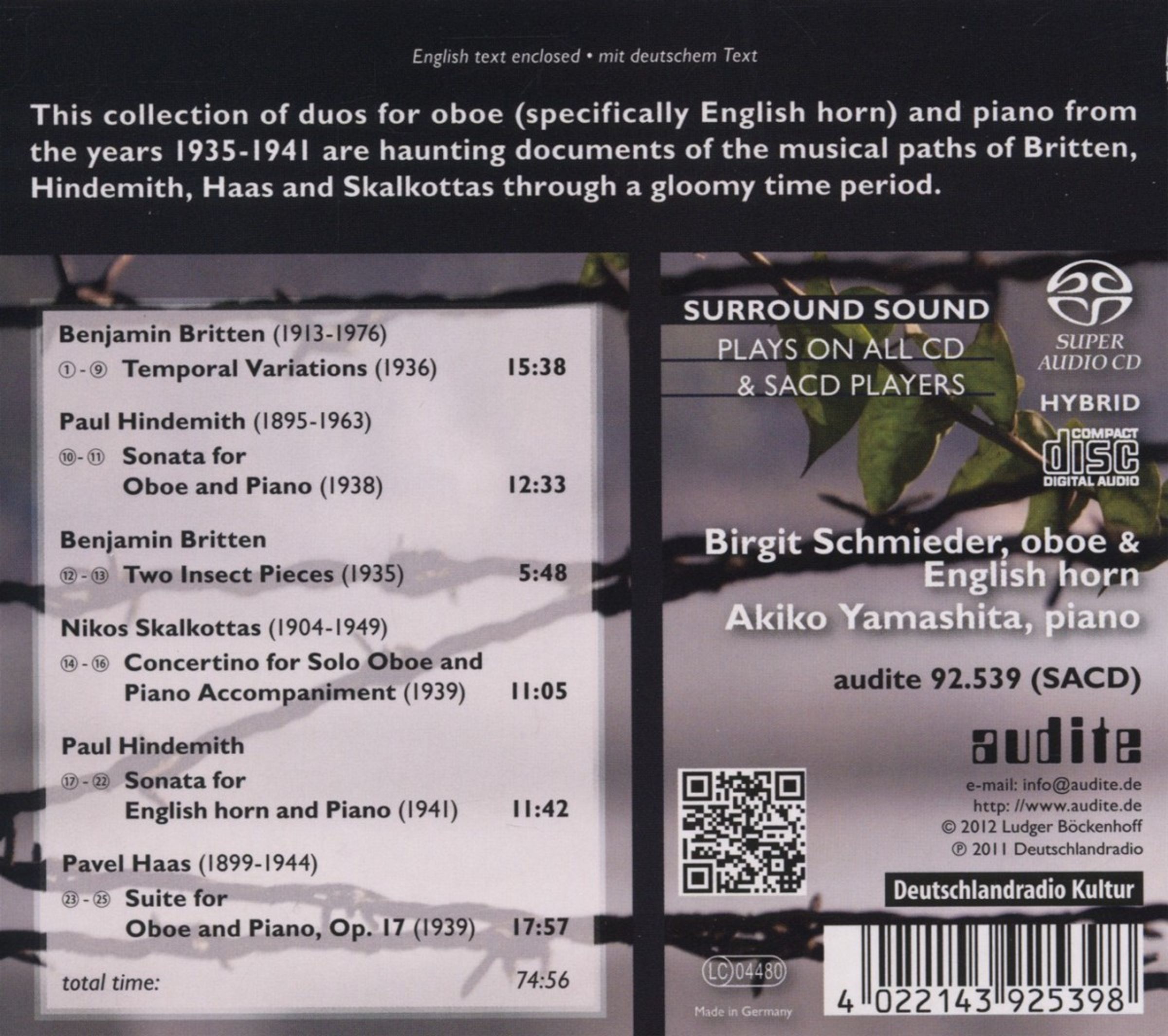 Die vorliegenden Duo-Werke für Oboe (bzw. Englischhorn) und Klavier von Benjamin Britten, Pavel Haas, Paul Hindemith und Nikos Skalkottas sind nicht nur durch ihren Entstehungszeitraum der Jahre 1935-1941 aufeinander bezogen, sondern bilden auch als eindringliche Dokumente kompositorischer Lebenswege in einer sich zunehmend verdüsternden Zeit einen engen Zusammenhang. Hindemiths Sonaten für Oboe bzw. Englischhorn und Klavier reflektieren Verinnerlichung und handwerkliche Gelassenheit vor und während der Emigration. Die Suite von Pavel Haas ist ein subtiler Protest gegen die Annektion der Tschechoslowakei durch NS-Deutschland. Skalkottas’ Concertino ist Teil des einzigartigen Oeuvres, das der Schüler Schönbergs in künstlerischer Isolation und unter desolaten äußeren Umständen in seiner griechischen Heimat schrieb. In den beiden genialischen Stücken des jungen Benjamin Britten schließlich ist unter der Oberfläche virtuosen Glanzes ein tiefes Unbehagen gegenüber den politischen Verhältnissen der Vorkriegszeit spürbar. Eine enorme Bereicherung für das schmale Repertoire der Oboenliteratur im 20. Jahrhundert, stellen diese Werke eine ebenso anspruchsvolle musikalische wie gestalterische Herausforderung für die Interpreten dar.