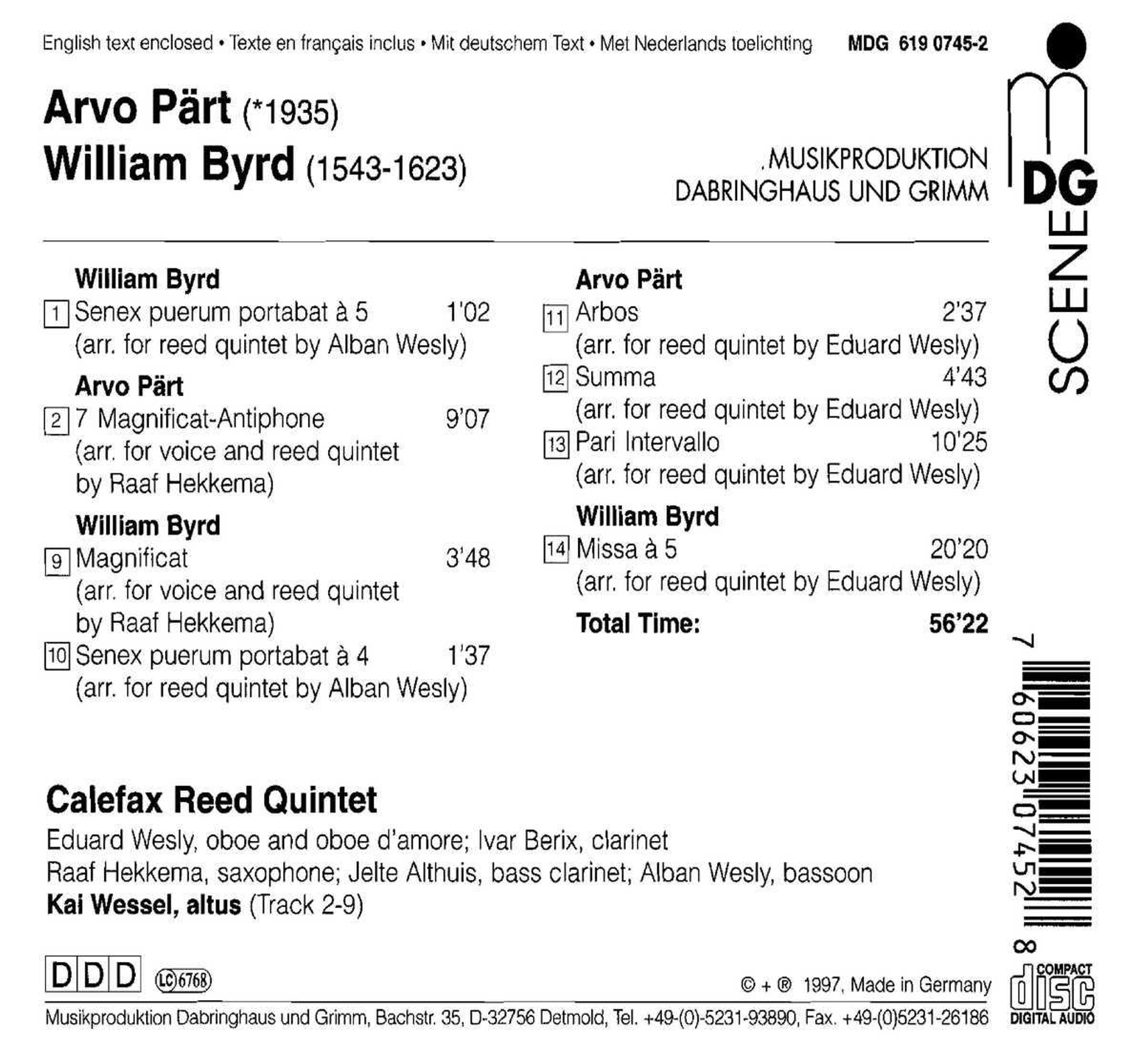 Der große Renaissancekomponist William Byrd und der baltische Neutöner Arvo Pärt haben mehr als nur die Einsilbigkeit ihres Nachnamens gemein: Beide fußen in der Kompositionslehre des Mittelalters und der Renaissance und sind in dieser Einspielung des Calefax Reed Quintets vertreten, »des holländischen Bläserensembles der besonderen Art«. Und beide werden von einer betont klanglichen Seite ins rechte Licht gestellt, zu Wort gebracht durch den Altus Kai Wessel. Grund genug, diese bemerkenswerte Aufnahme wieder zu veröffentlichen.