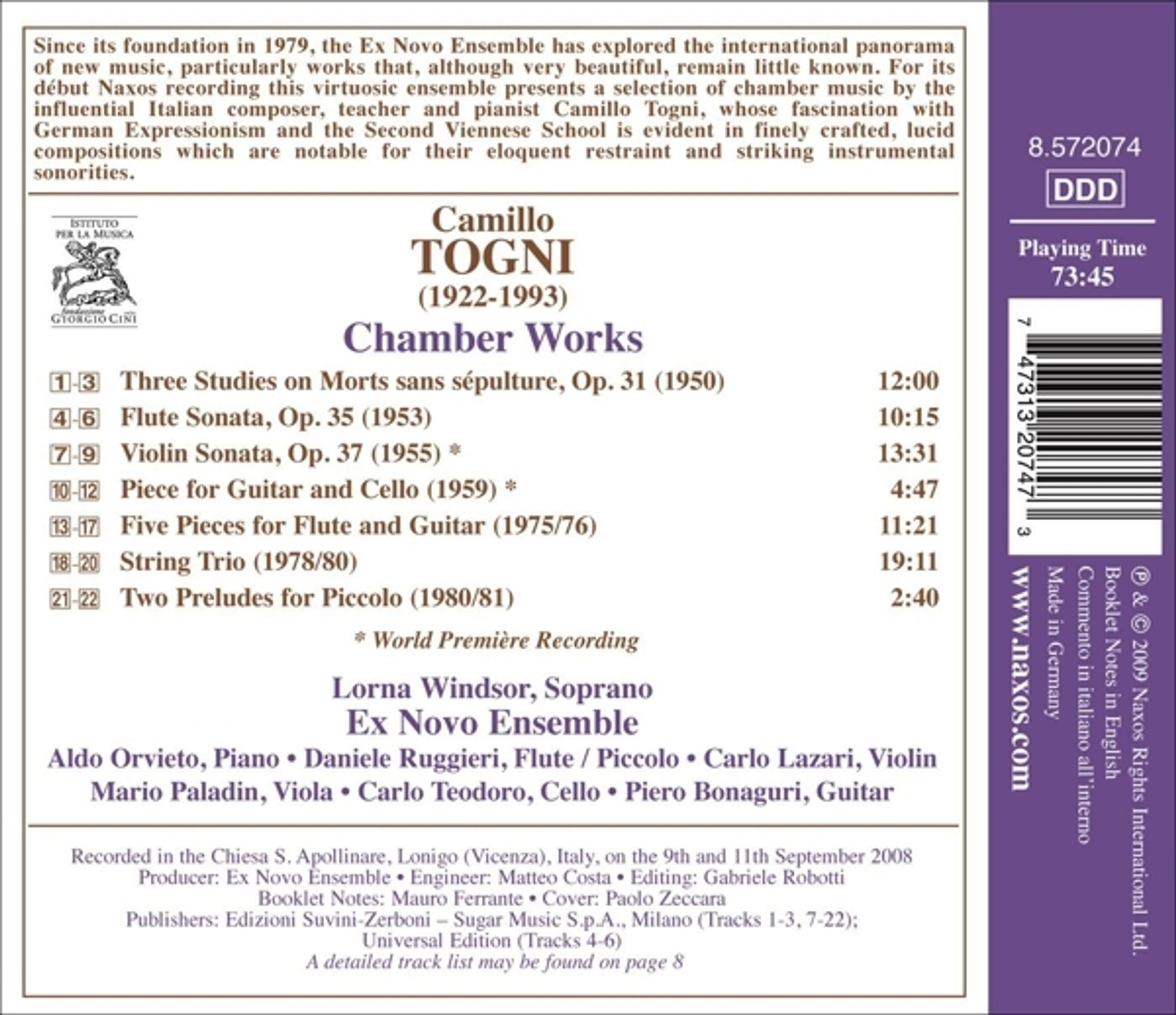 Since its foundation in 1979, the Ex Novo Ensemble has explored the international panorama of new music, particularly works that, although very beautiful, remain little known. For its début Naxos recording this virtuosic ensemble presents a selection of chamber music by the influential Italian composer, teacher and pianist Camillo Togni, whose fascination with German Expressionism and the Second Viennese School is evident in finely crafted, lucid compositions which are notable for their eloquent restraint and striking instrumental sonorities.