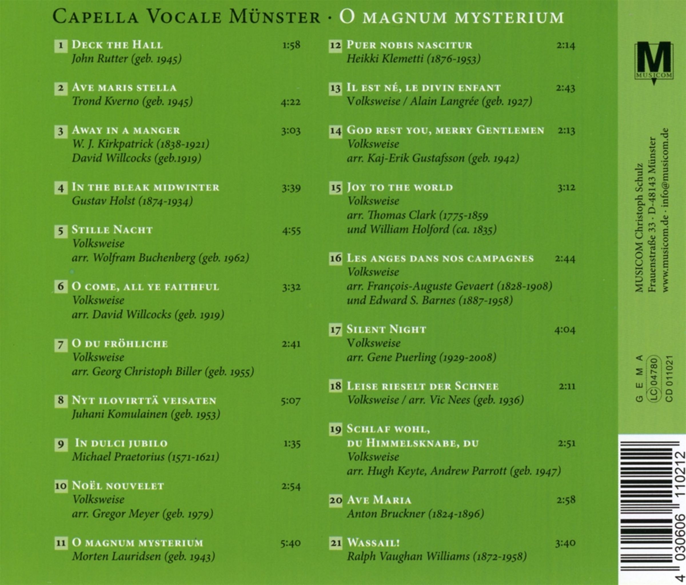 Deck the Hall; Ave Maris Stella; Away in a Manger; In the Bleak Midwinter; Stille Nacht; O Come, All Ye Faithful; O Du Fröhliche; Nyt Ilovirttä Veisaten; In Dulci Jubilo; Noel Nouvelet; O Magnum Mysterium; Puer Nobis Nascitur; Il Est Ne, Le Divin Enfant; God Rest You, Merry Gentlemen; Joy to the World; Les Anges Dans Nos Campagnes; Silent Night; Leise rieselt der Schnee; Schlaf wohl, du Himmelsknabe, du; Ave Maria; Wassail