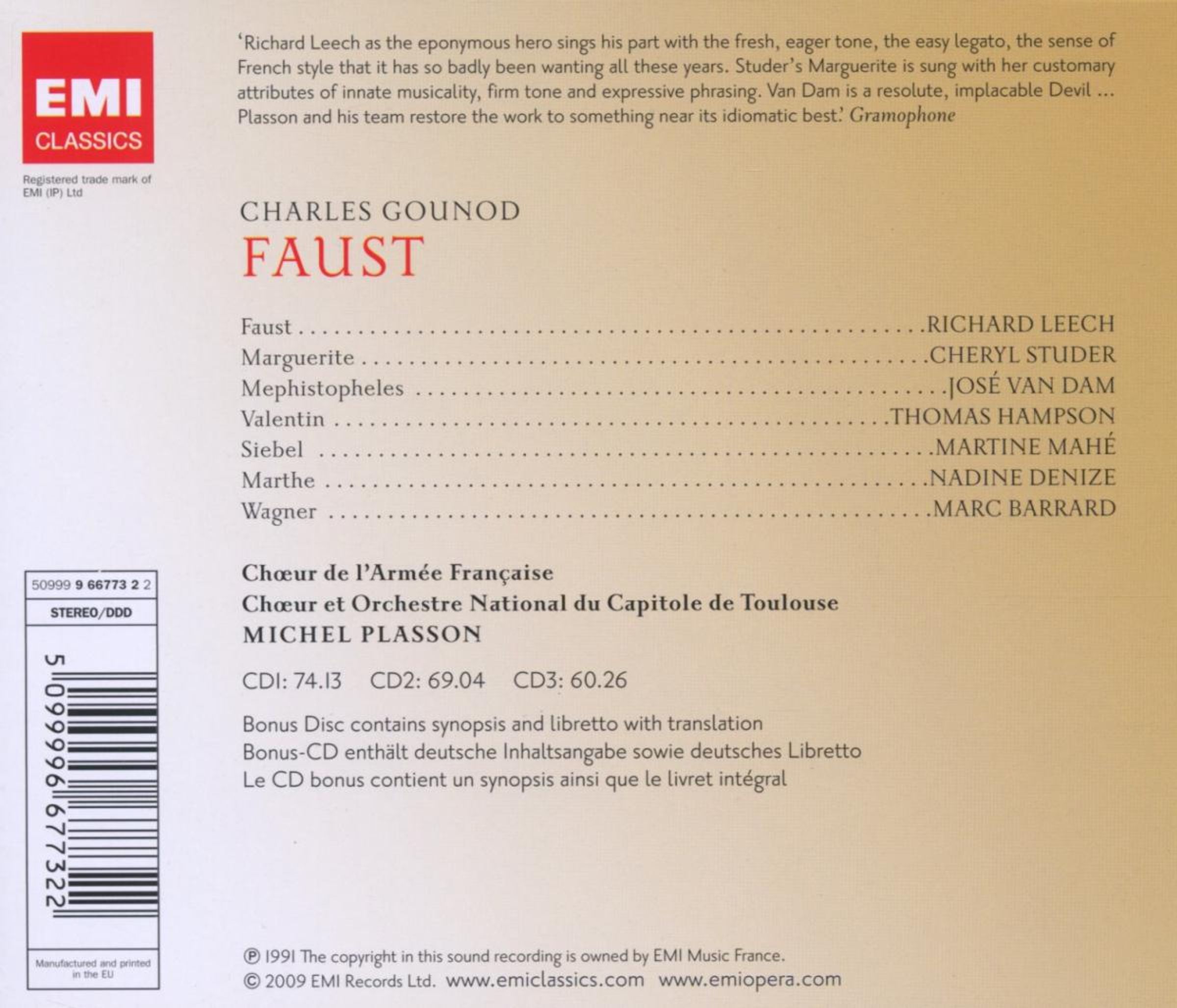 K. Malisch in FonoForum 2/92:"Das Hauptver- dienst für das überragend hohe vokale Niveau gebührt dem Titelhelden. Seine Partie stellt enorme Anforderungen - der Tenor erfüllt sie glänzend. Ähnlich beeindruckend Cheryl Studer. Ihre Marguerite vereint Musikalität und Aus- drucksstärke, lyrische Innerlichkeit und dra- matische Akzente. Eine weitere Glanzleistung: Jose van Dams Mephisto. Akribie, Differen- ziertheit und Kultur dieses wirklich 'singen- den' Mephisto überzeugen."Disk 1 von 3 (CD)