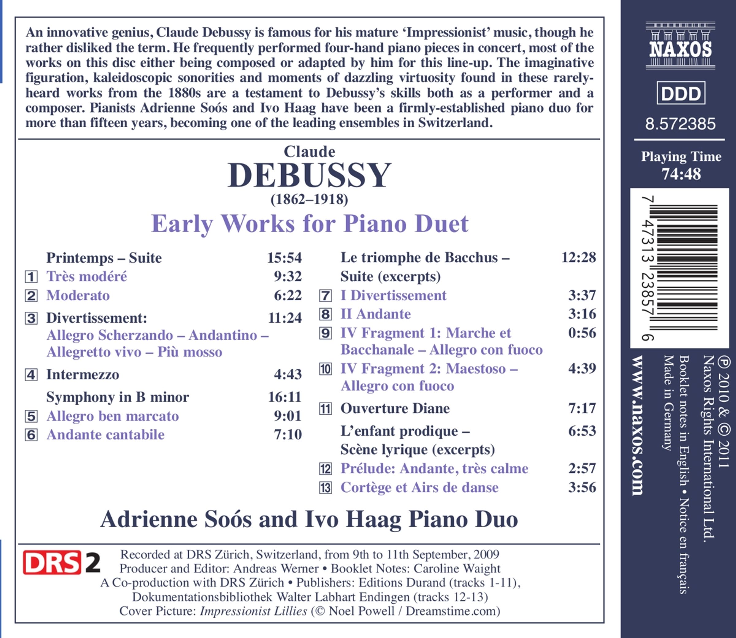 Auch wenn ihm selbst der Begriff nicht sonderlich gefiel, ging Claude Debussy insbesondere mit seinen reifen „impressionistischen“ Werken als innovativer Genius in die Musikgeschichte ein. Regelmäßig spielte er bei Konzerten vierhändige Klavierstücke, und auch die Mehrzahl der Werke auf dieser CD wurde entweder von ihm für diese Besetzung geschrieben oder arrangiert. Die fantasievolle Gestaltung, die kaleidoskopische Klangfülle und die umwerfende Virtuosität dieser selten gehörten Kompositionen aus den 1880er Jahren weisen Claude Debussy als einen exzellenten Musiker und Komponisten aus.