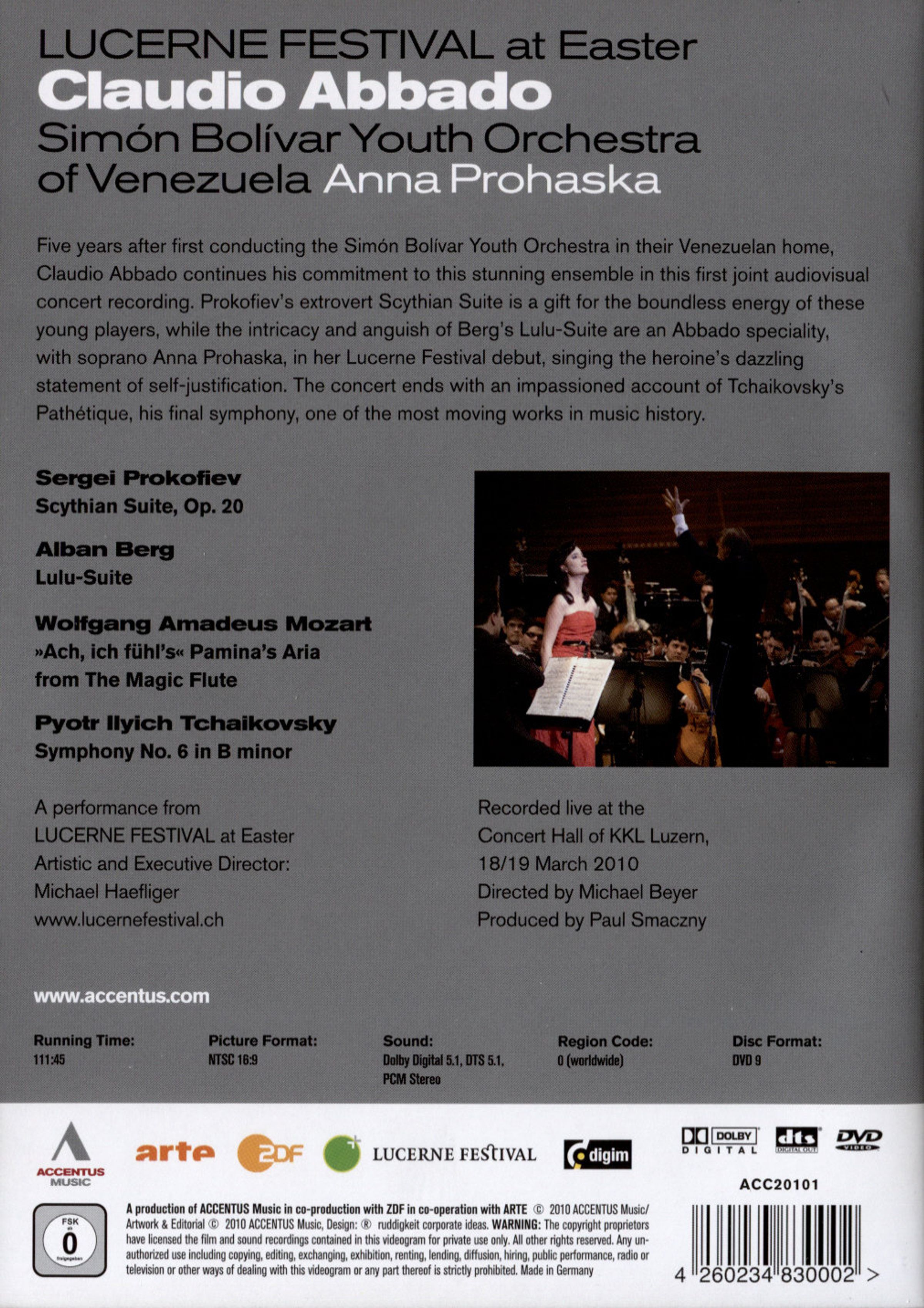 Fünf Jahre nach der ersten Zusammenarbeit mit dem Simón Bolívar Youth Orchestra in dessen venezolanischen Heimat, setzt Claudio Abbado sein Engagement mit diesem erstaunlichen Ensemble fort. Prokofjews mitreißende Skythische Suite ist ein echtes Geschenk für die grenzenlose Energie, die diese jungen Musiker in sich haben. Die Komplexität und Atmosphäre von Seelenpein von Bergs Lulu-Suite sind eine Spezialität für den Maestro Abbado. Die junge Sopranistin Anna Prohaska, die mit diesem Mitschnitt ihr Luzern-Debüt gibt, singt das ergreifende Selbstbekenntnis der Titelfigur. Das Konzert endet mit Tschaikowskis Pathétique, mit der der Komponist seine persönliche Beschreibung einer Reise von der Verzweiflung zur Resignation abgab.