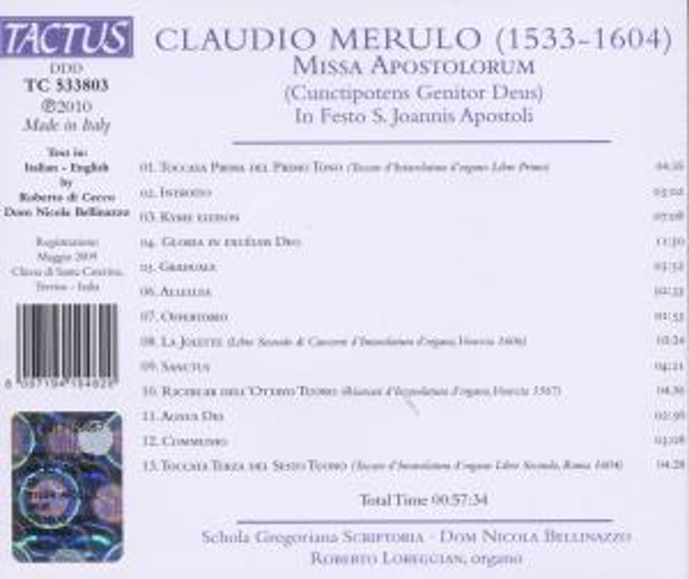 Claudio Merulo, obwohl einer der wichtigsten Vertreter der italienischen Renaissance, fiel lange Zeit nahezu vollständig dem Vergessen anheim. Nur in einigen Madrigalsammlungen lebte sein Name noch fort, und die Organisten kannten noch einige Toccaten von ihm.