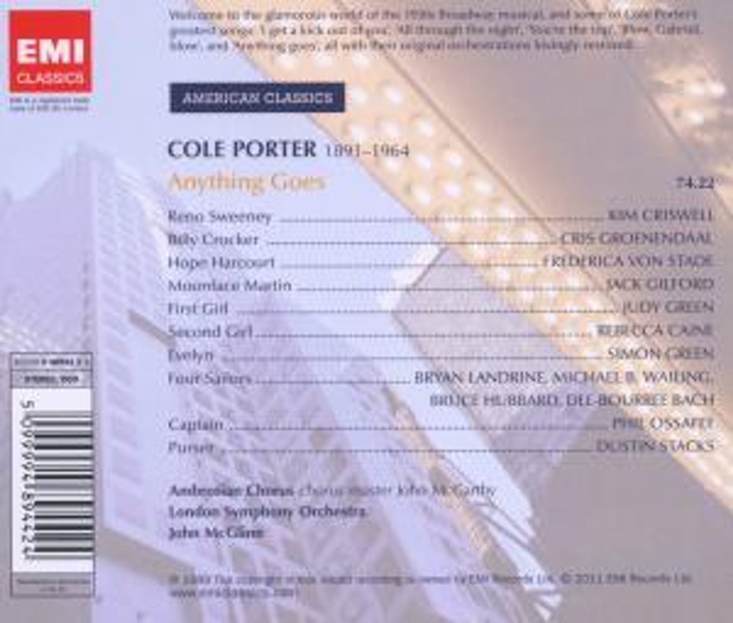 Orpheus 1/90:"Anything Goes" liegt nun also zum ersten Mal in einer wissenschaftlich ab- gesicherten 'Originalversion' vor! John McGlinn und seiner langjährigen Forschungsarbeit ver- danken wir diesen Eindruck, der ein überaus angenehmer ist."Disk 1 von 1 (CD)