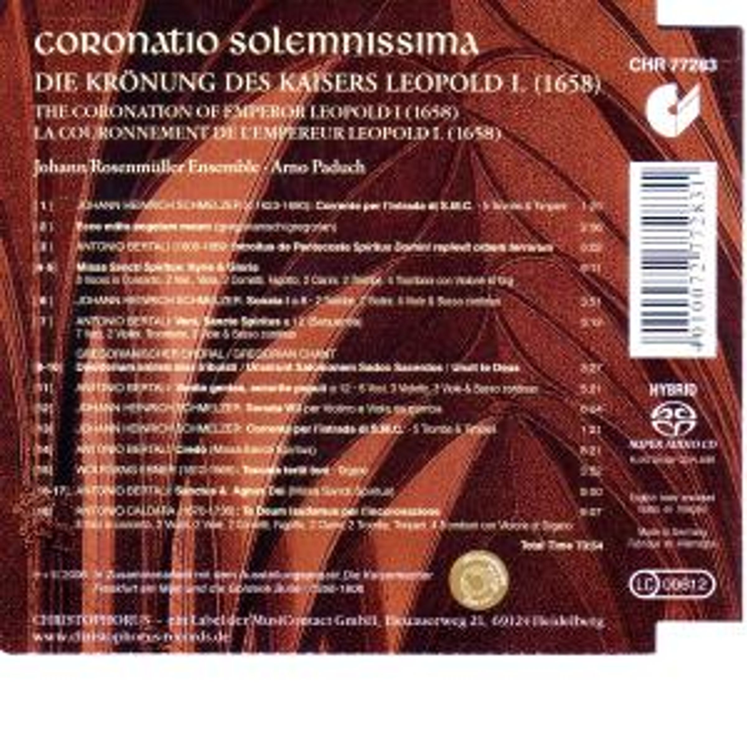 Die Quellen geben keine direkten Hinweise auf die Musik, und nur durch den Abgleich der liturgischen Vorgaben mit den überlieferten Praktiken und den historischen Gegebenheiten konnten die Werke, die zur Krönung von Kaiser Leopold I. erklungen sein müssen, ermittelt und in verschiedenen Bibliotheken wieder gefunden werden. Das Johann Rosenmüller Ensemble unter Arno Paduch präsentiert so die prachtvolle Missa Sancti Spiritus für acht Chorstimmen und großer Instrumentalbesetzung von Antonio Bertali (1605–59) sowie weitere Motetten des Komponisten und Instrumentalwerke von Johann Heinrich Schmelzer.