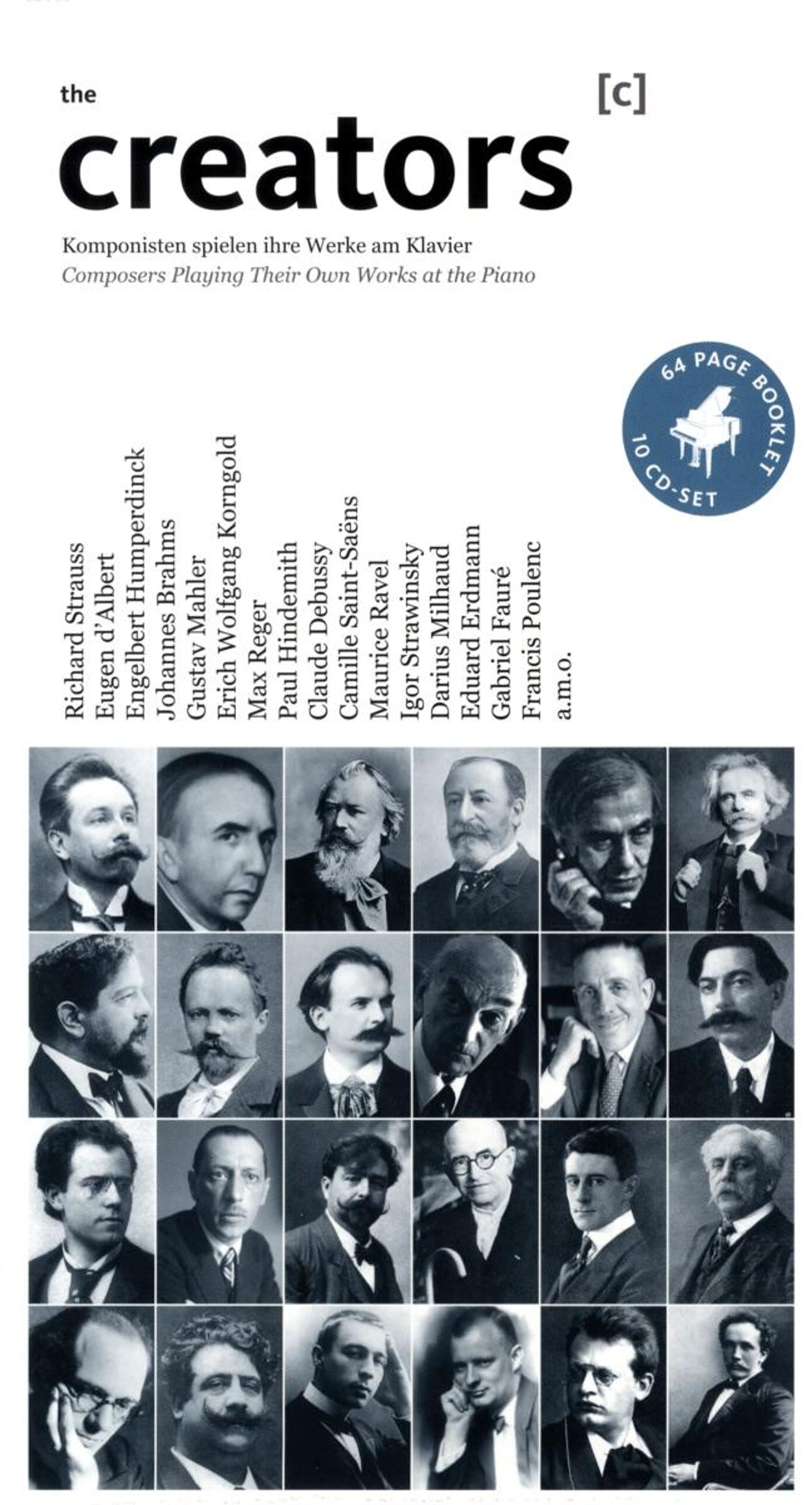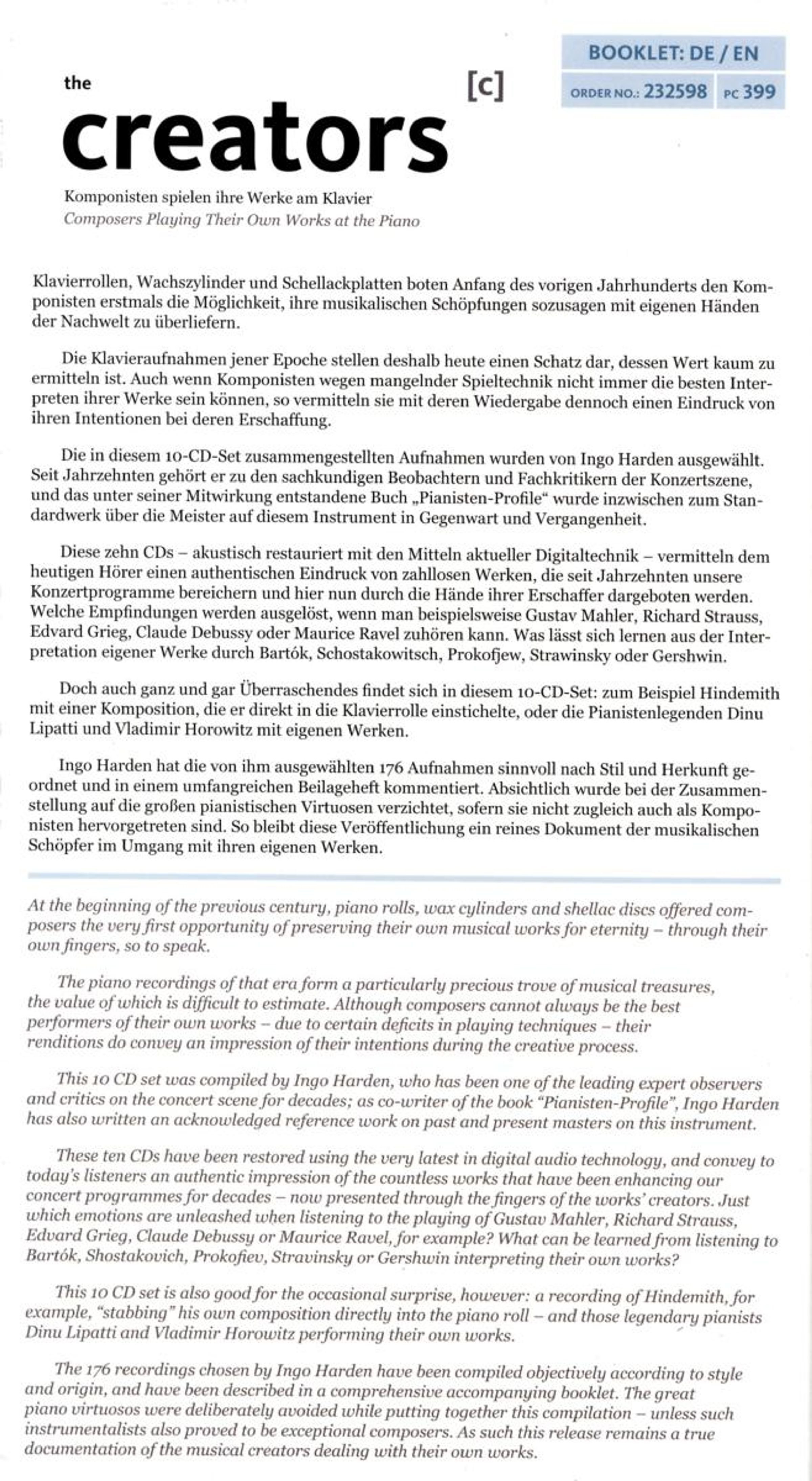 Klavierrollen, Wachszylinder und Schellackplatten boten Anfang des vorigen Jahrhunderts den Komponisten erstmals die Möglichkeit, ihre musikalischen Schöpfungen sozusagen mit eigenen Händen der Nachwelt zu überliefern. Die Klavieraufnahmen jener Epoche stellen deshalb heute einen Schatz dar, dessen Wert kaum zu ermitteln ist. Diese zehn CDs vermitteln dem Hörer einen authentischen Eindruck von zahllosen Werken, die seit Jahrzehnten unsere Konzertprogramme bereichern und hier nun durch die Hände ihrer Erschaffer dargeboten werden. Mit Werken von Strauss, Humperdinck, Albert, Korngold, Brahms, Mahler, Reger, Hindemith, Erdmann, Saint-Saens, Faure, Debussy, Ravel, Milhaud, Strawinsky, Poulenc, Messiaen, Grieg u. a.