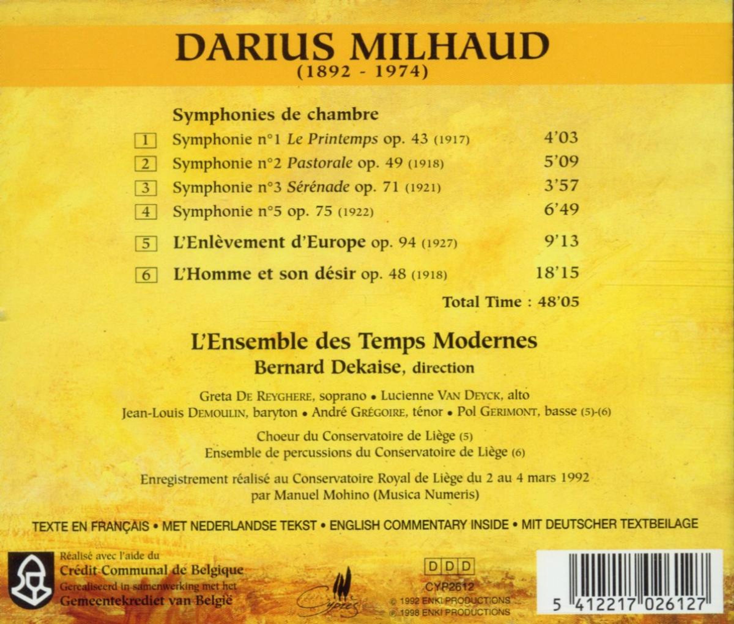 F. Sommer in KLASSIK heute 9/99: "Dekaise und sein Ensemble meistern die raffiniert vertrackt komponierten Stücke durchweg mit großer rhythmischer Präzision. Auch die Solostellen sind ausgezeichnet, vor allem die Bläser in der fünften Sinfonie und sie Sänger in der 'Minutenoper'."Disk 1 von 1 (CD)