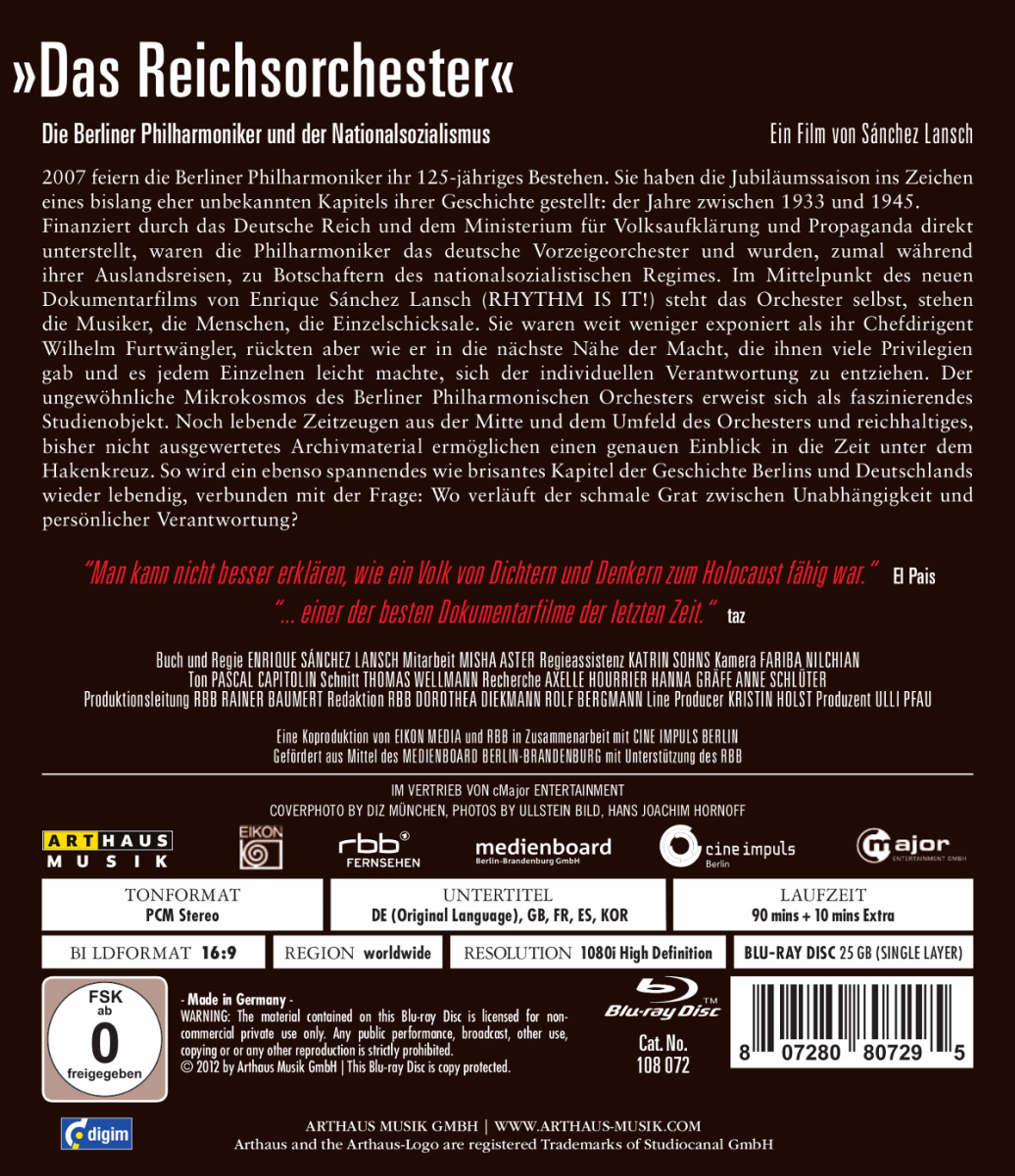 Die Berliner Philharmoniker und der Nationalsozialismus. Dieser Film von Enrique Sanchez Lansch wirft einen Blick auf die Jahre zwischen 1933 und 1945, einem eher unbekannten Kapitel in der Geschichte des Berlin PO. Finanziert durch das Deutsche Reich, waren die Philharmoniker das Vorzeigeorchester und somit Repräsentanten des nationalsozialistischen Regimes. Im Mittelpunkt des Films steht das Orchester selbst, die Musiker, die Menschen, die Einzelschicksale. Sie waren weit weniger exponiert als ihr Chefdirigent Wilhelm Furtwängler, rückten aber in dieser Zeit in die nächste Nähe der Macht. Sie lebten und arbeiteten im Kollektiv. Das schützte sie, erleichterte aber auch den Einzelnen, sich nicht der individuellen Verantwortung zu stellen - auch nach 1945. Noch lebende Zeitzeugen und bisher nicht präsentiertes Archivmaterial ermöglichen einen Einblick in den Mikrokosmos. Ein ebenso spannendes wie brisantes Kapitel der Geschichte Berlins und Deutschlands wird wieder lebendig.