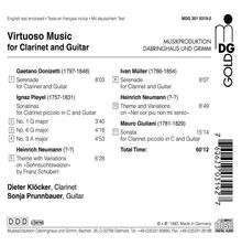 A. Beaujean in stereoplay 8/90:"Alle diese Komponisten wirkten im ersten Viertel des 19. Jahrhunderts. Die Klarinette ist zum Teil sehr anspruchsvoll eingesetzt, die Gitarre hat fast nur Begleitfunktion. Klöcker spielt sehr ton- schön und flexibel. Eine Sache für Klarinet- tisten und Freunde dieses Instruments."Disk 1 von 1 (CD)