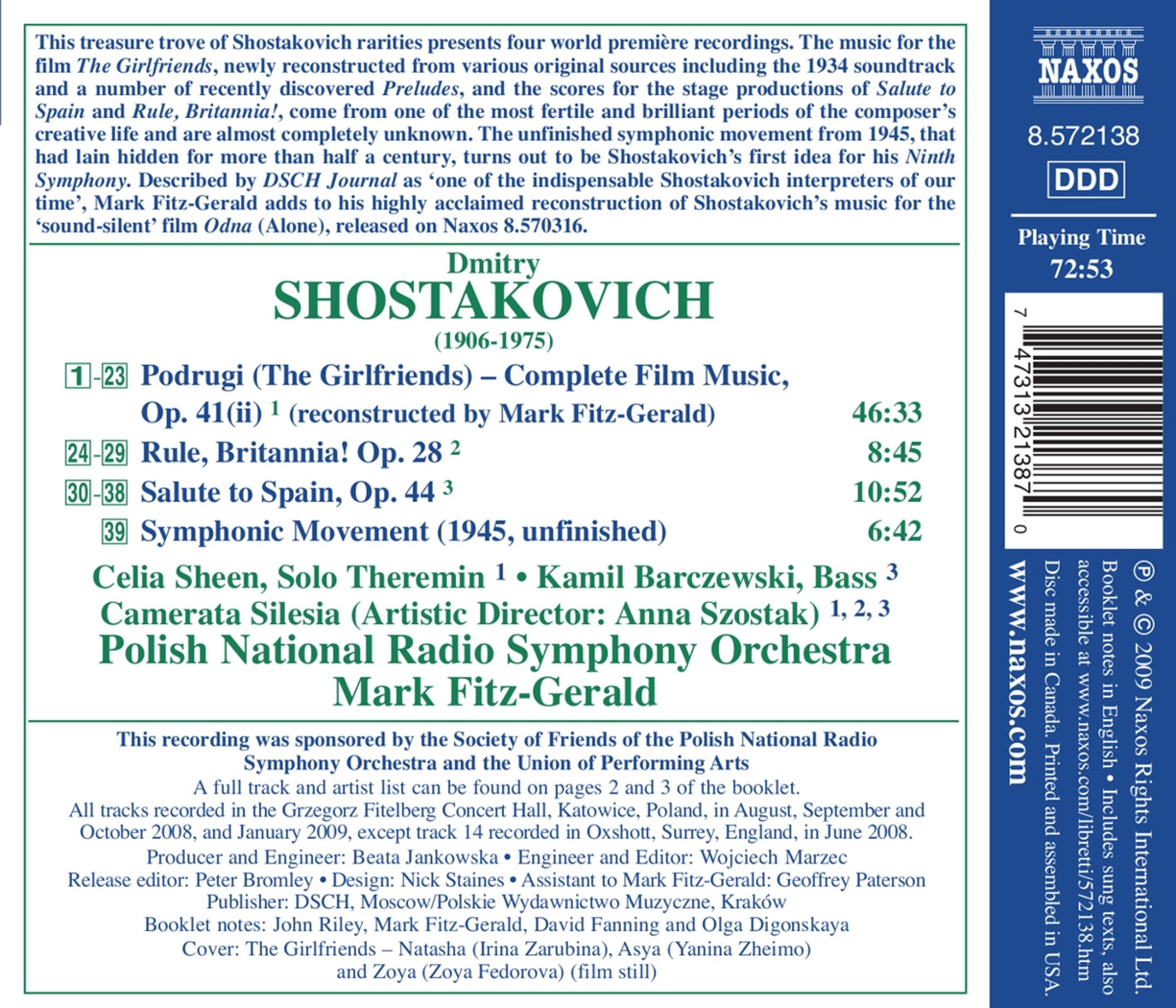 This treasure trove of Shostakovich rarities presents four world première recordings. The music for the film The Girlfriends, newly reconstructed from various original sources including the 1934 soundtrack and a number of recently discovered Preludes, and the scores for the stage productions of Salute to Spain and Rule, Britannia!, come from one of the most fertile and brilliant periods of the composer's creative life and are almost completely unknown. The unfinished symphonic movement from 1945, that had lain hidden for more than half a century, turns out to be Shostakovich's first idea for his Ninth Symphony. Described by DSCH Journal as 'one of the indispensable Shostakovich interpreters of our time', Mark Fitz-Gerald adds to his highly acclaimed reconstruction of Shostakovich's music for the 'sound-silent' film Odna (Alone), released on Naxos 8.570316.