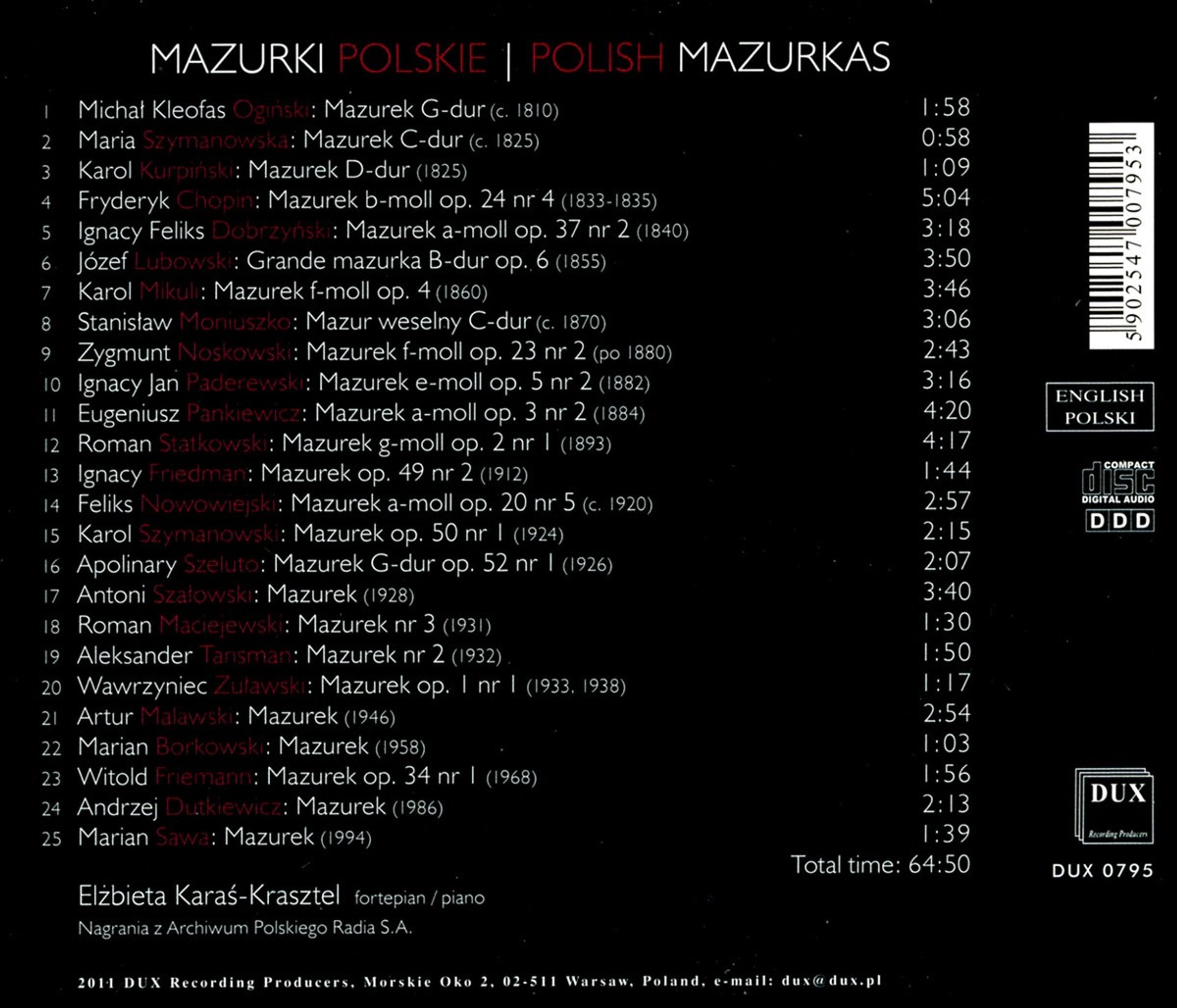 Die 'Mazurka' ist sicherlich einer der populärsten polnischen Volkstänze, der auch außerhalb Polens Eingang in die Kunstmusik fand. Am authentischsten und leidenschaftlichsten kann aber wohl nur ein Pole eine Mazurka komponieren. Die polnische Pianistin Elzbieta Karas-Krasztel spannt in ihrer aufschlussreichen Aufnahme mit Mazurken polnischer Komponisten den Bogen vom 19. bis zum Ende des 20. Jahrhunderts.