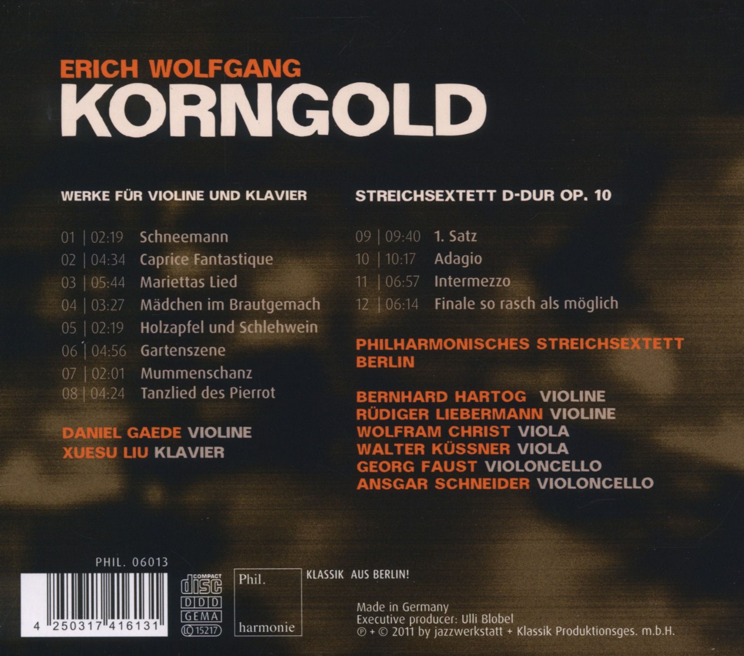 In den Werken für Violine und Klavier zeigt sich im Wechselspiel zwischen groteskem Humor und augenblicklichen melodischen Aufschwüngen die erstaunliche Plastizität des Erfindungsreichtums des jungen Korngold. Korngold greift im Streichsextett in D auf die klassischen Formen zurück, setzt sie aber individuell um; die tonalen Harmonien werden bisweilen bis an ihre Grenzen gedehnt, ohne ihre bedeutungsvolle Funktion zu berühren; die sechs Stimmen sind zwar polyphon konzipiert, können aber orchestral erklingen - all das gehört zum Handwerk des genialen Heranwachsenden. Korngolds Ballett "Der Schneemann" war eine seiner frühen großen Leistungen, die er im Alter von elf Jahren schrieb. Wenig später komponierte er das "Wichtelmännchen" und die "Caprice fantastique" aus den "Märchenbildern" op. 3 für Klavier. Es folgen zwei Hits aus der erfolgreichen Oper "Die Tote Stadt": Glück, das mir verblieb" und das "Tanzlied des Pierrot" sind im Wesentlichen Walzer, die in den Fassungen für Violine sehr beredt sind. Das Sextett entstand 1914 / 15, kurz nach der Fertigstellung von "Violanta"; die Uraufführung erfolgte 1917 durch ein Ensemble unter der Leitung von Arnold Rosé, dem berühmten Konzertmeister der Wiener Philharmoniker. Korngold greift auf klassische Formen zurück, berührt aber mit der Begabung eines genialen Heranwachsenden, was den Vergleich mit Passagen aus Schönbergs Sextett "Verklärte Nacht" von 1899 nahelegt.