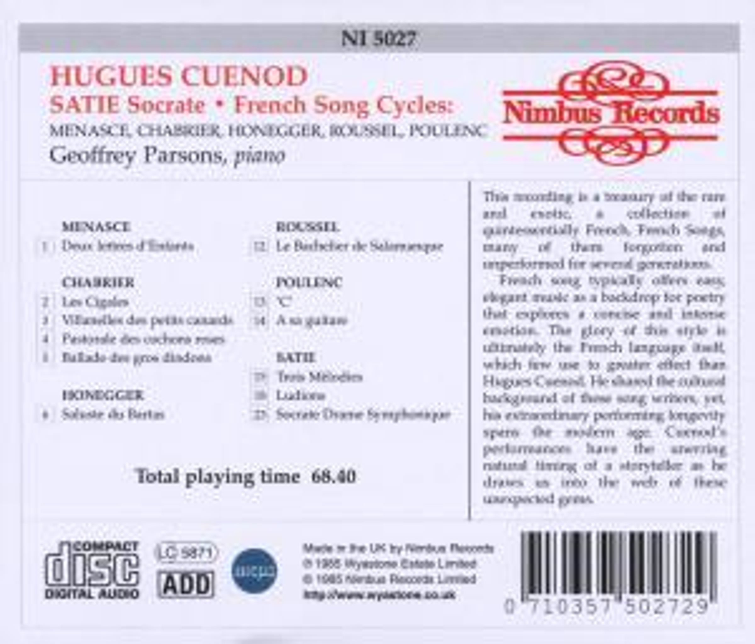 Französische Lieder bieten typischerweise leichte, elegante Musik als Hintergrund für Poesie, die eine prägnante und intensive Emotion erforscht. Der Ruhm dieses Stils ist letztlich die französische Sprache selbst, die nur wenige so wirkungsvoll einsetzen wie Hugues Cuenod.