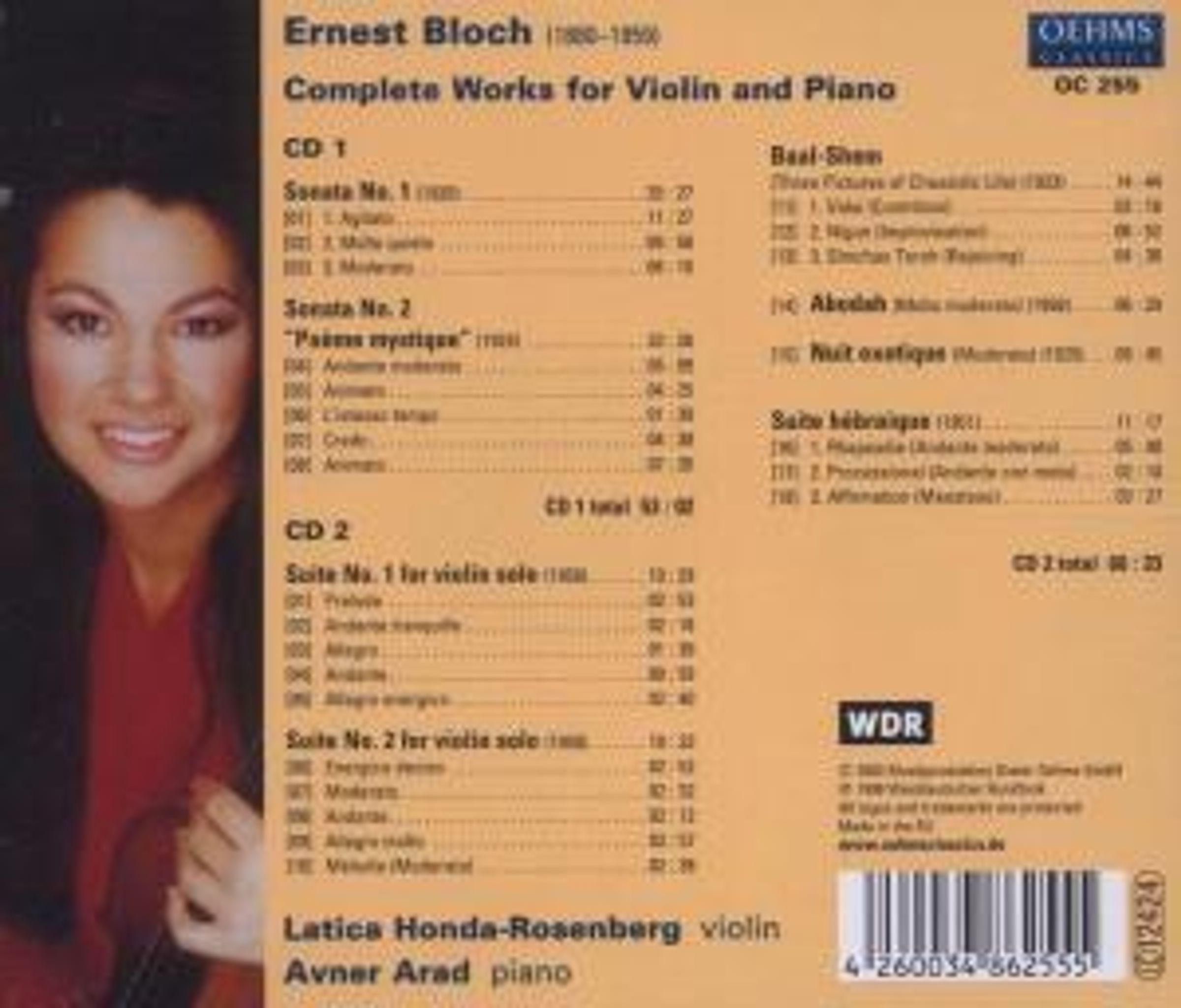P. T. Köster in KLASSIK heute 12/00: "Die Geigerin Latica Honda-Rosenberg kostet das breite Ausdrucksspektrum der Blochschen Musik genußvoll aus. Sie meistert die dra- matischen Ausbrüche ebenso wie die meditativen Passagen, gestaltet die Spannungsbögen sinnfällig und läßt die Pausen atmen. Der Pianist Avner Arad agiert als gleich- berechtigter Partner mit wacher Präsenz und feinem Klang."Disk 1 von 2 (CD)