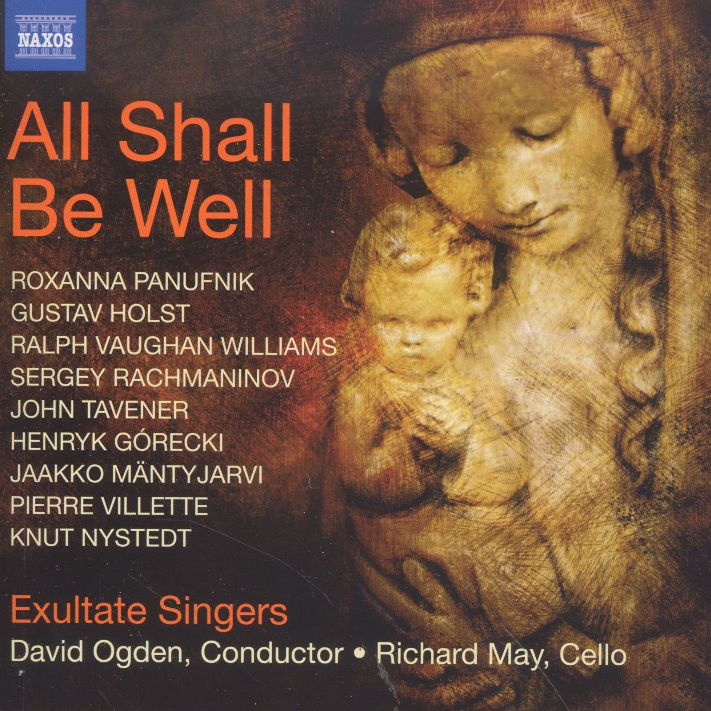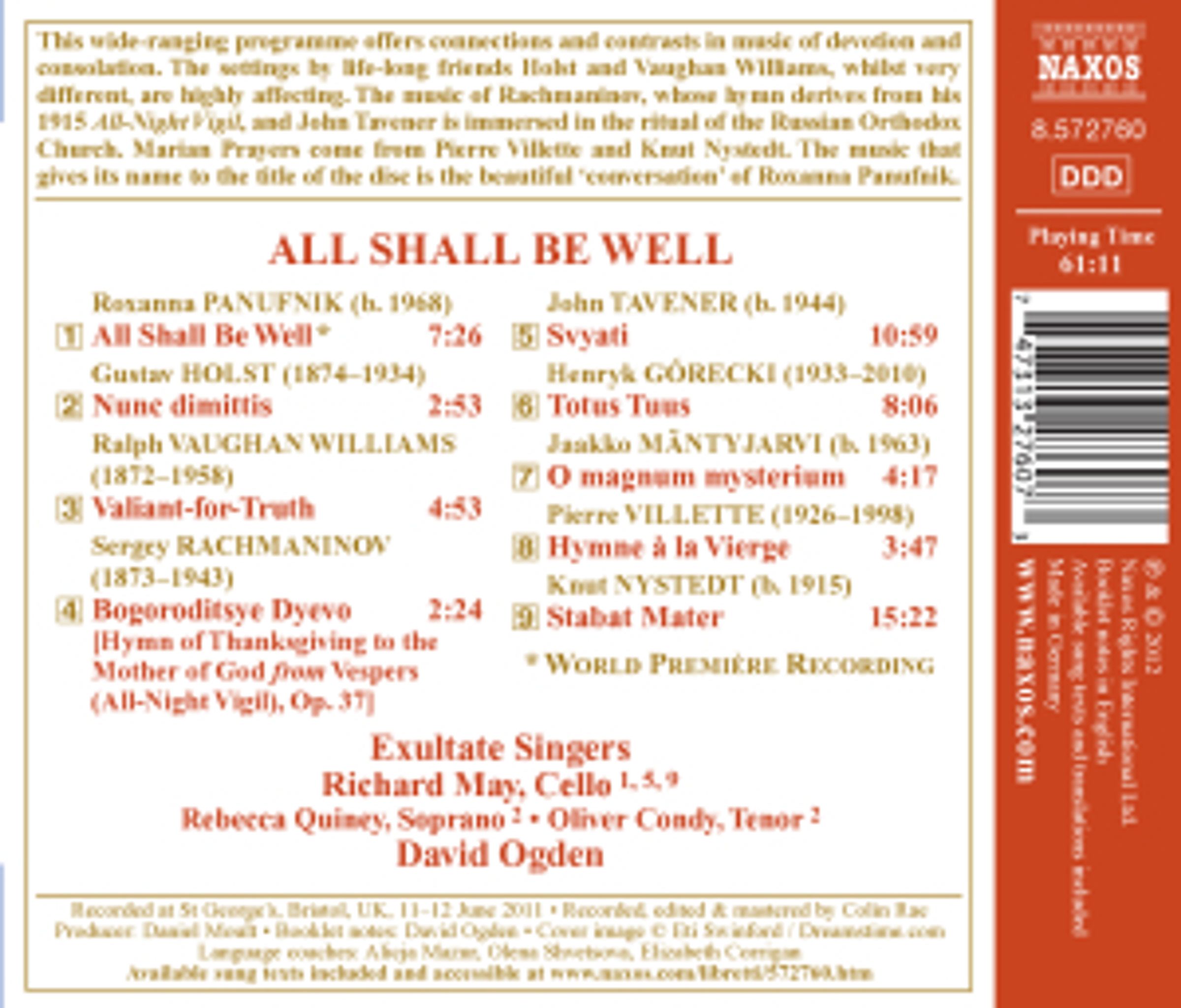 Durch ein weitreichendes Programm werden auf der vorliegenden CD die Gemeinsamkeiten als auch die Kontraste andächtiger und Trost spendender Musik offenbar. Holst und Vaughan Williams, die eine lebenslange Freundschaft verband, erzeugen wenn auch durch unterschiedliche Methoden eine ergreifende und berührende Atmosphäre. Die Hymne Rachmaninows und auch die Musik von John Tavener tauchen in die Rituale der Russischorthodoxen Kirche ein. Mit musikalischen Gebeten wenden sich Pierre Villette und Knut Nystedt an die Heilige Jungfrau Maria. Namensgeber für die vorliegende CD ist Roxanna Panufniks Werk „All shall be well“.