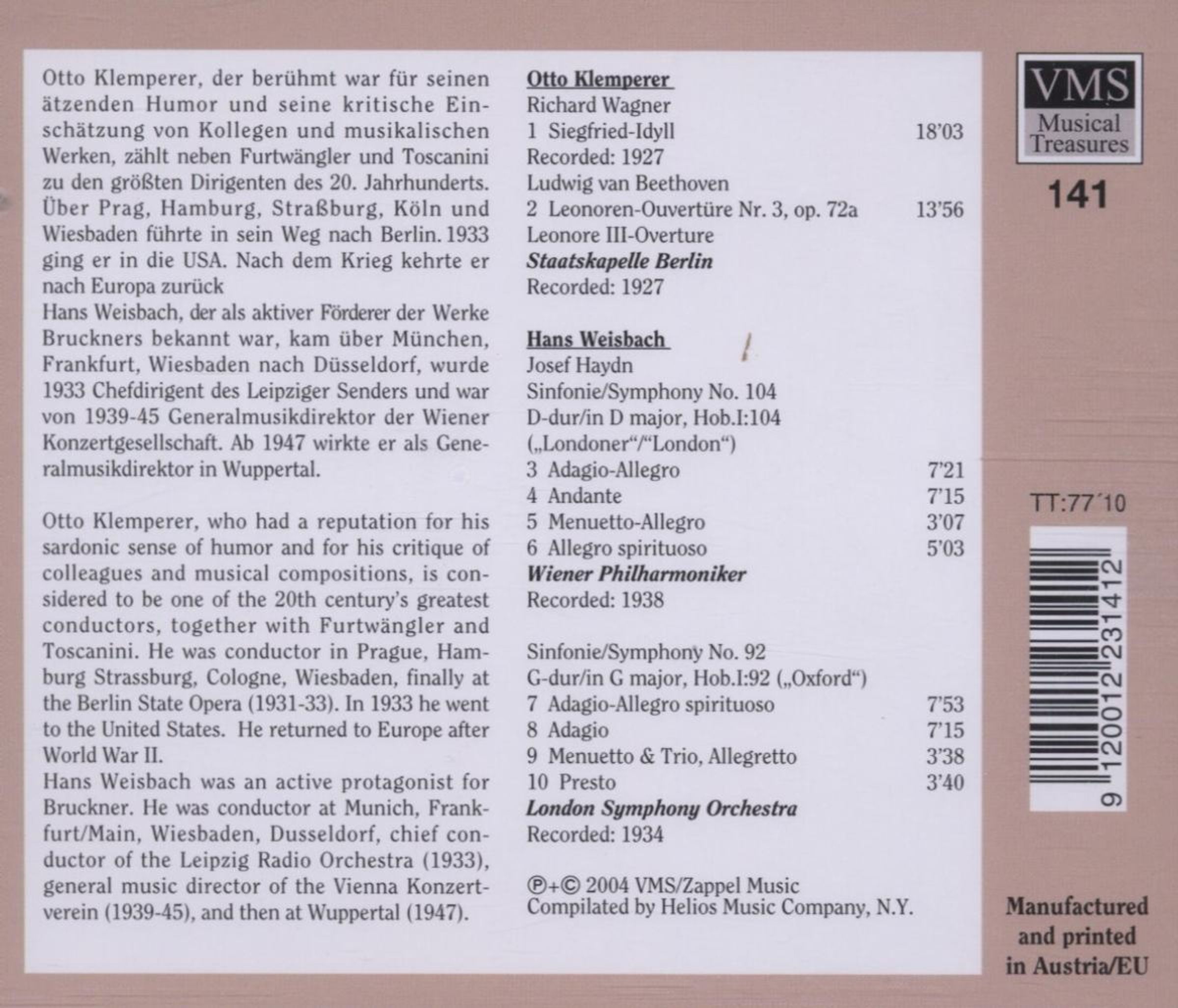 - Staatskapelle Berlin, Otto Klemperer; Wiener Philharmoniker, London Symphony Orchestra, Hans Weisbach