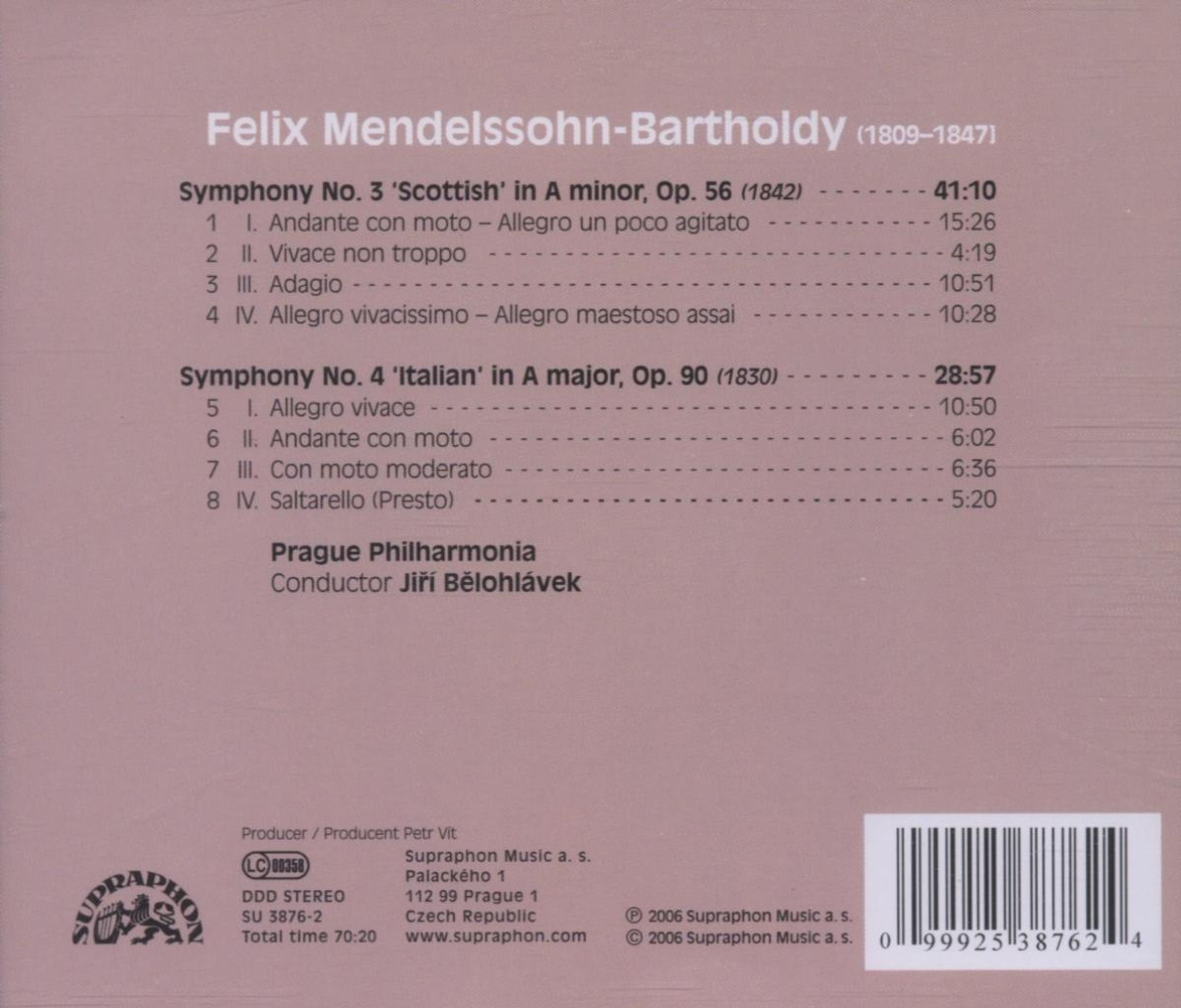 Jiri Belohlavek, longtime principal conductor of the Prague Philharmonia and also principal conductor of the BBC London Symphony Orchestra, has produced a new recording of Mendelssohn's famous "Scottish" and "Italian" symphonies. Both symphonies are from Mendelssohn's peak creative years, the "Italian" dating from 1833 and the "Scottish" from 1842. Both were also inspired by the lands and landmarks of their respective titles, and by Mendelssohn's travel experiences there. The Scottish Symphony reflects the unique melancholy of the Scottish highlands, and the Italian, on the other hand, is one of Mendelssohn's merriest, as he himself wrote. This recording is marked by Belohlavek's long years of detailed work with this versatile ensemble of energetic musicians. Mendelssohn's symphonies are part of the philharmonic's core repertoire, and Belohlavek's artistic experience has transformed them into extraordinary musical treats.